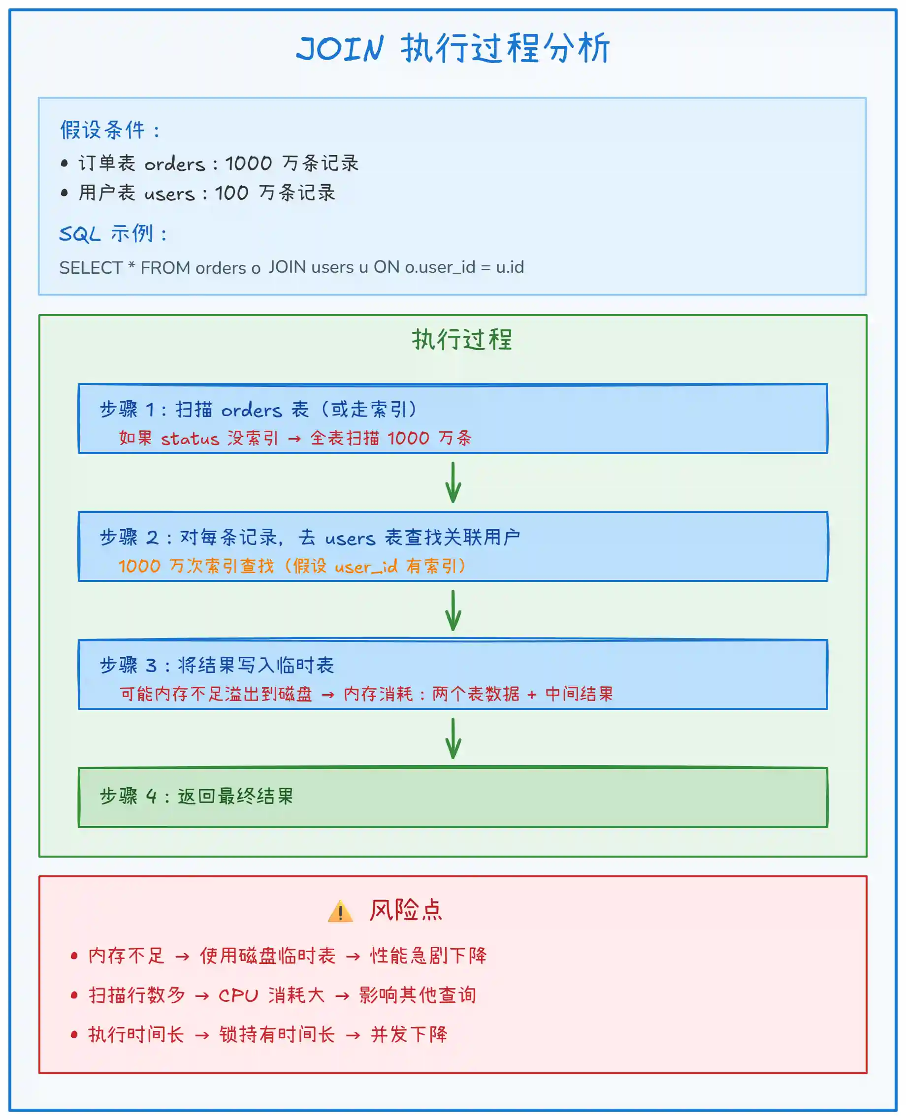 上图展示了 JOIN 操作的执行过程和潜在风险。具体说明: