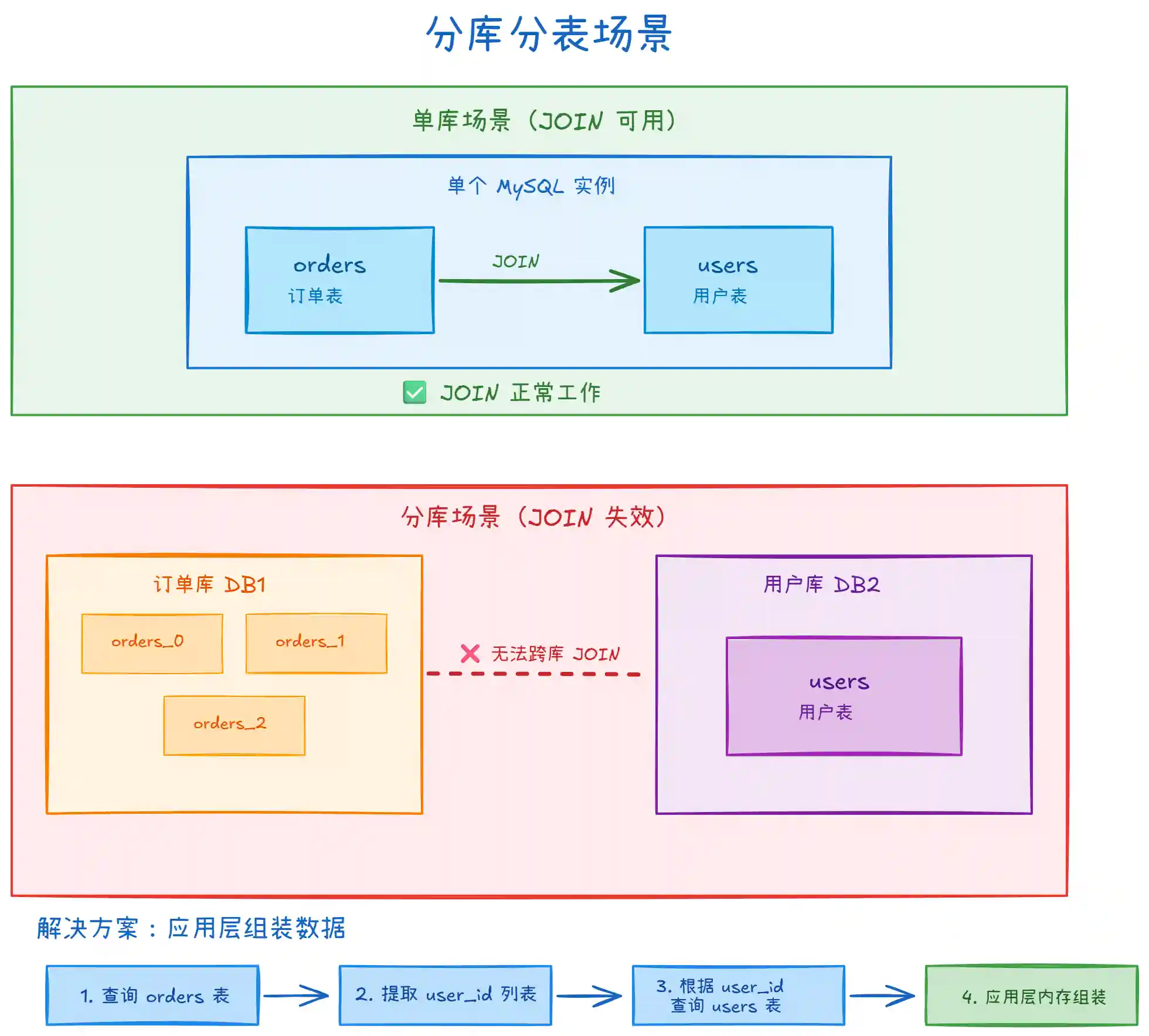 | 分库分表 | 跨库 JOIN 无法直接执行 | 架构受限 |