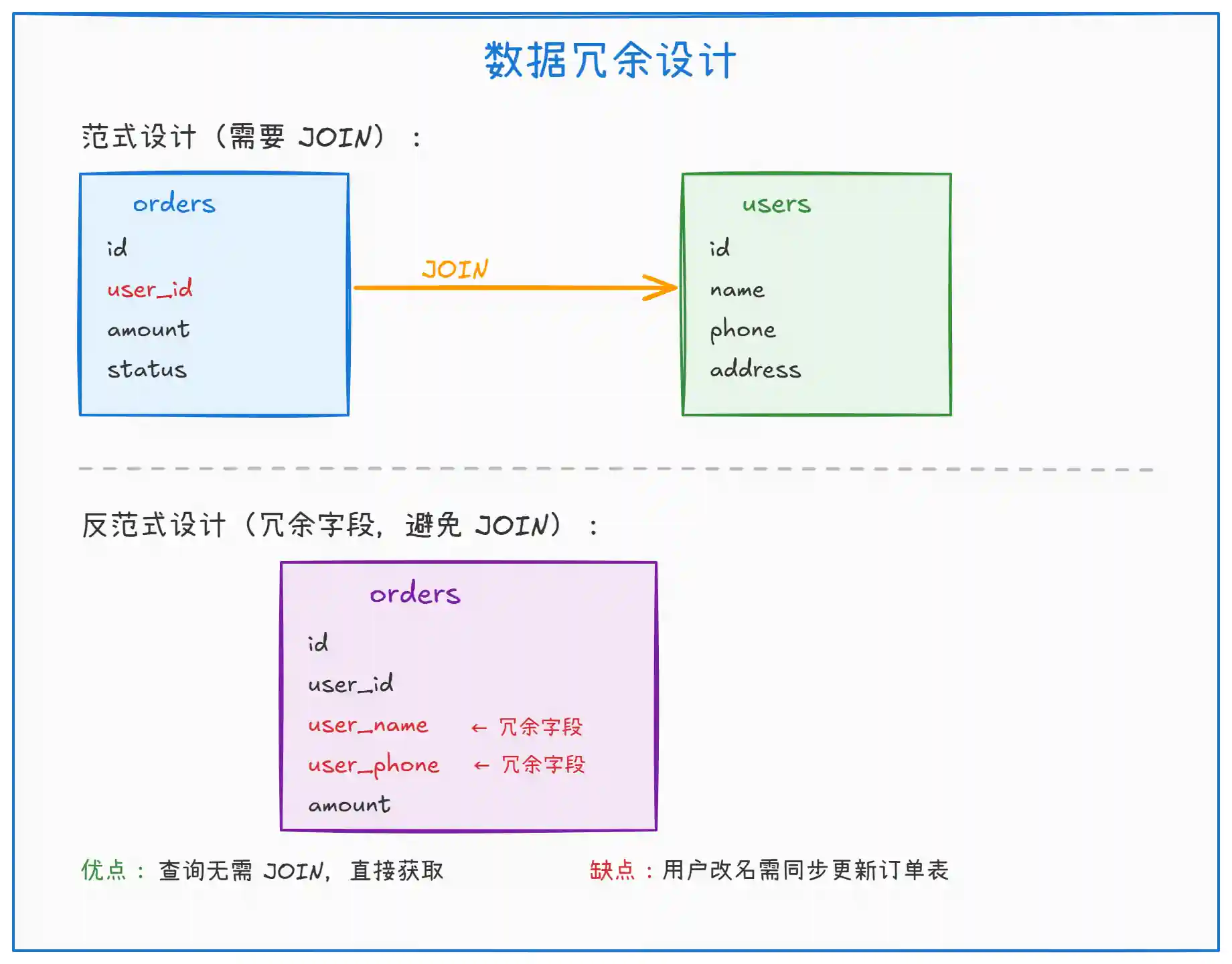 上图展示了通过数据冗余来避免 JOIN 的设计方案。核心思路: