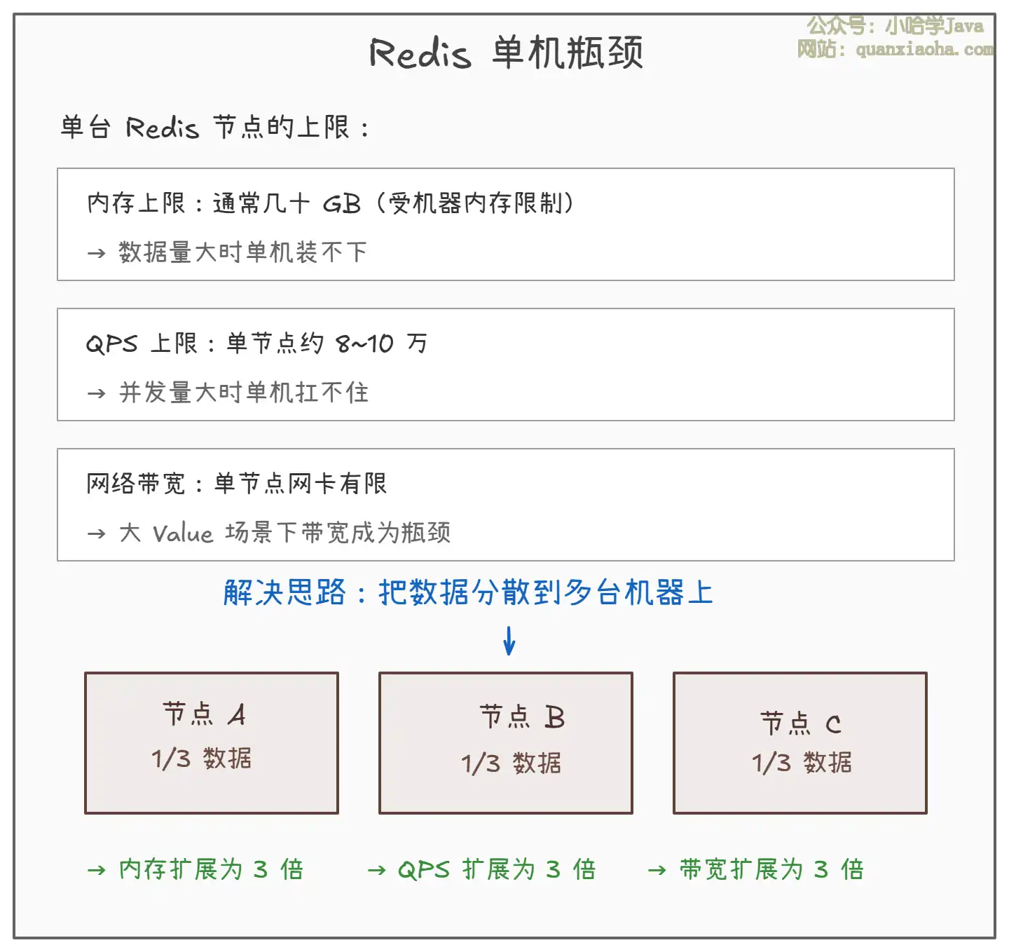 - 内存上限:单台 Redis 通常只能装几十 GB 数据,数据量超过单机内存时就装不下了。