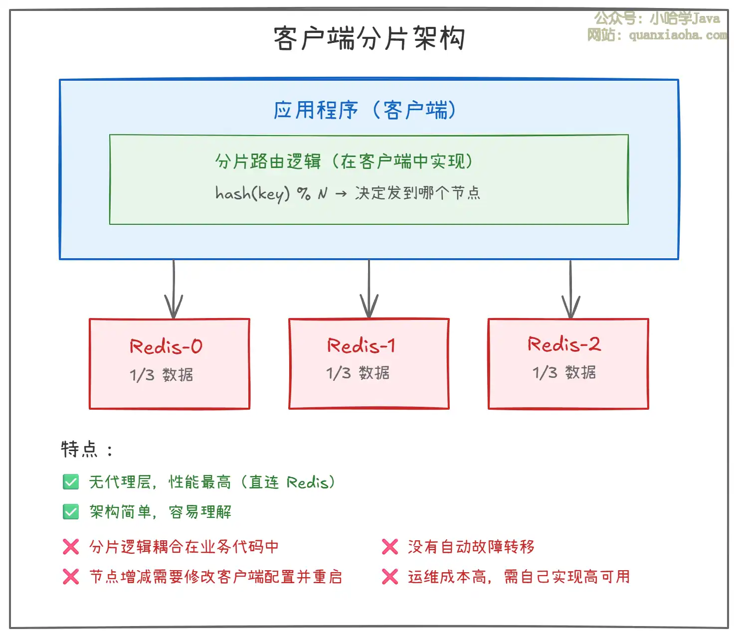 - 缺点:分片逻辑耦合在业务代码中,运维不便。节点增减需要修改客户端配置并重启应用,没有自动故障转移能力,需要自己搭建 Sentinel 等方案来保证高可用。