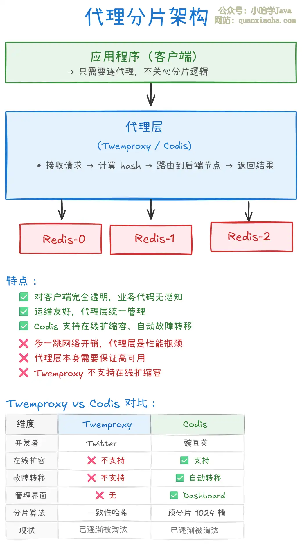 - 缺点:多了一跳网络开销(客户端 → 代理 → Redis),代理层本身可能成为性能瓶颈,也需要保证高可用。