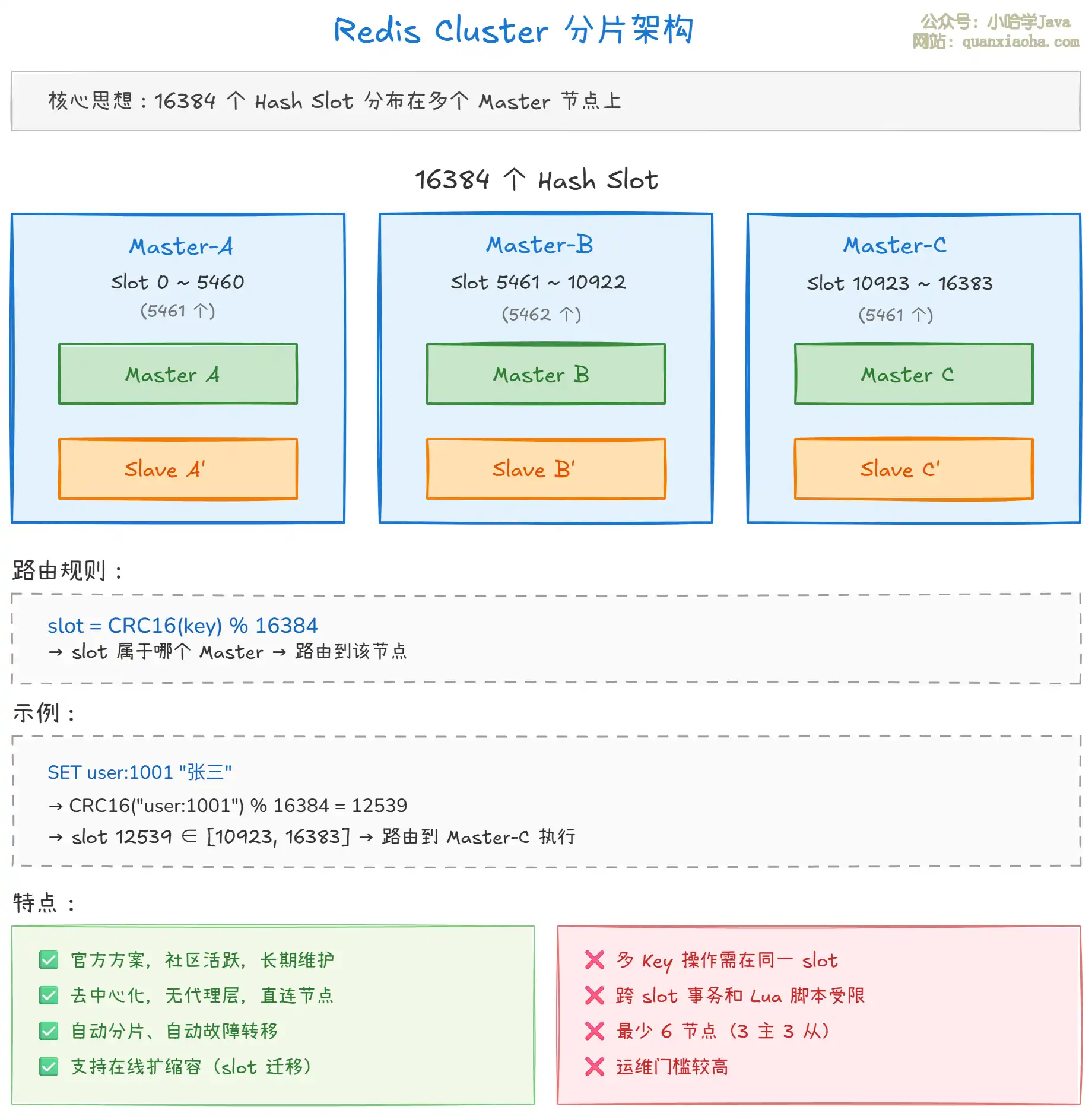 Cluster 核心:16384 slot 分片,CRC16 取模路由,Gossip 去中心化通信。