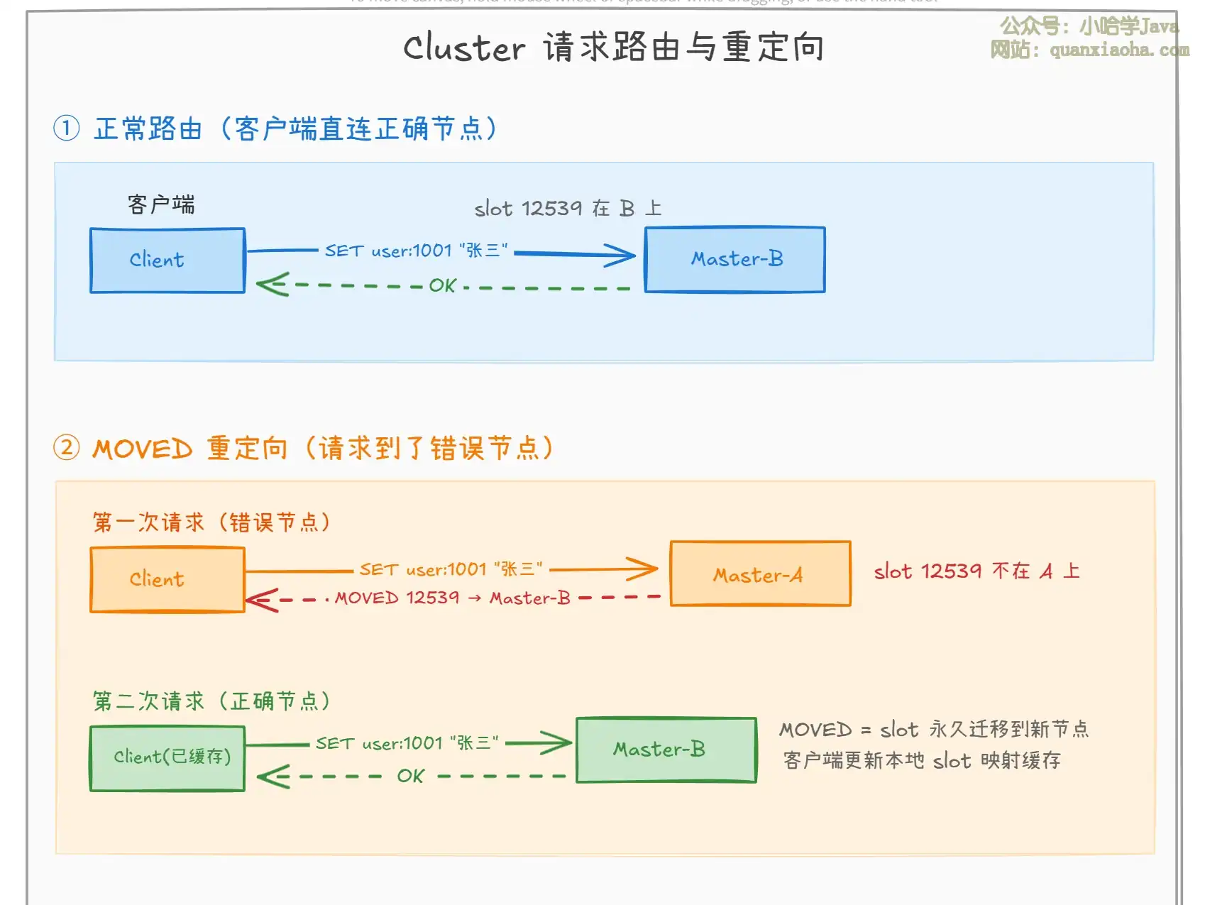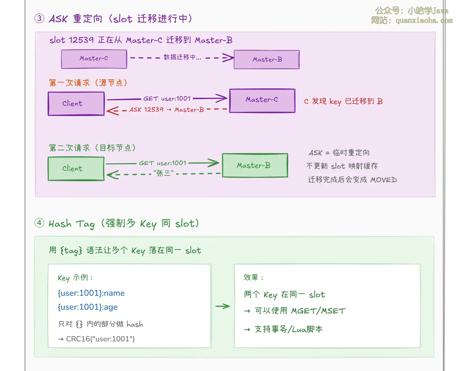 MOVED指令,告诉客户端正确的节点地址。客户端更新本地缓存,下次直接路由到正确节点。MOVED表示 slot 已经 永久迁移。 - ASK 重定向:slot 迁移过程中,请求到了源节点但 key 已迁移到目标节点。源节点返回