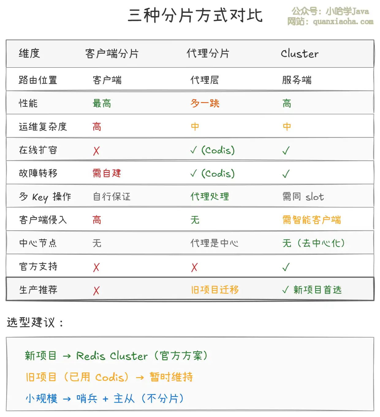 分片三种方式:客户端(最快但最累)→ 代理(透明但多一跳)→ Cluster(官方推荐)。