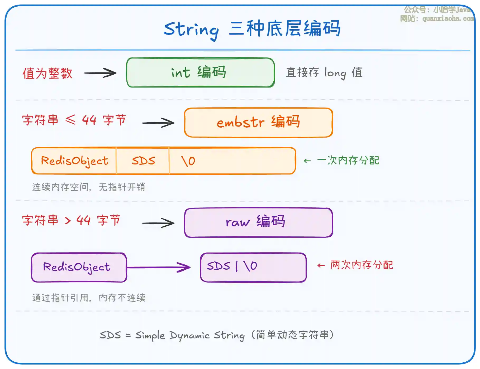 int:当值为整数且不超过long范围时使用,8 字节长整型embstr:当字符串长度 ≤ 44 字节时使用,一次内存分配,紧凑存储raw:当字符串长度 > 44 字节时使用,SDS(Simple Dynamic String)实现