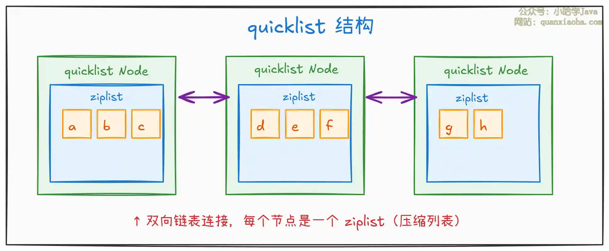 ziplist:不是每个元素一个节点,而是一个节点存多个连续元素(ziplist),兼顾内存紧凑和操作效率。 -