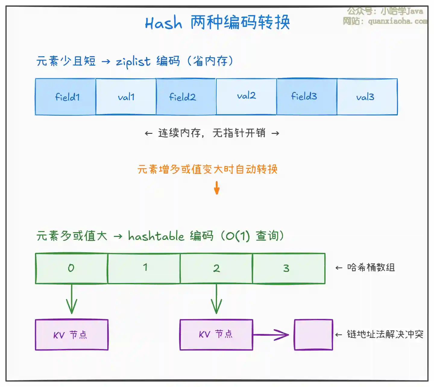 上图展示了 Hash 类型的两种编码及转换逻辑: