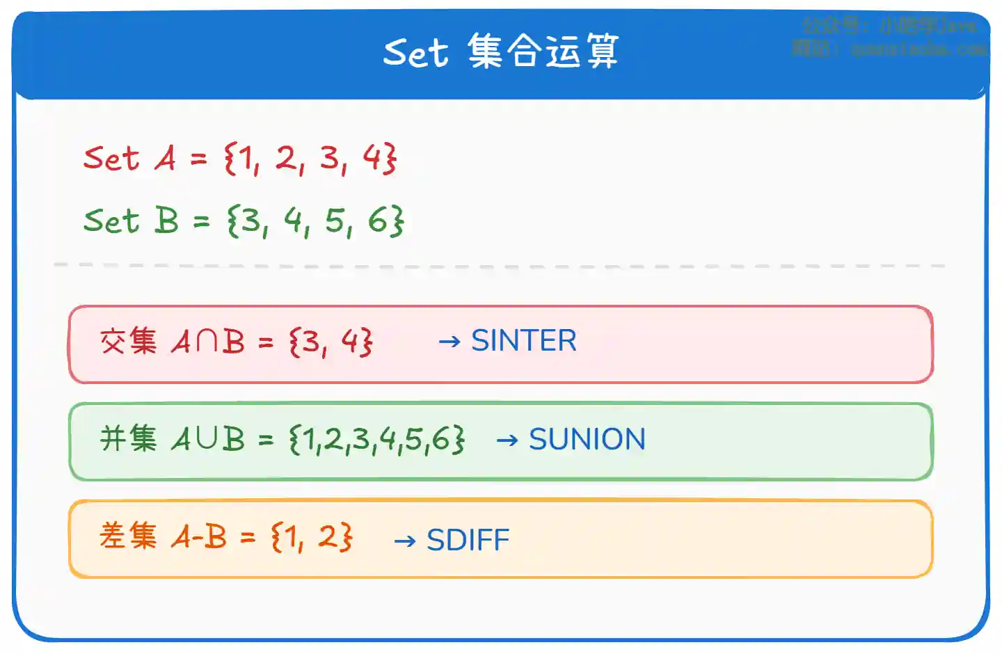 Set 是一个无序不重复的字符串集合,支持集合间的交集、并集、差集运算。