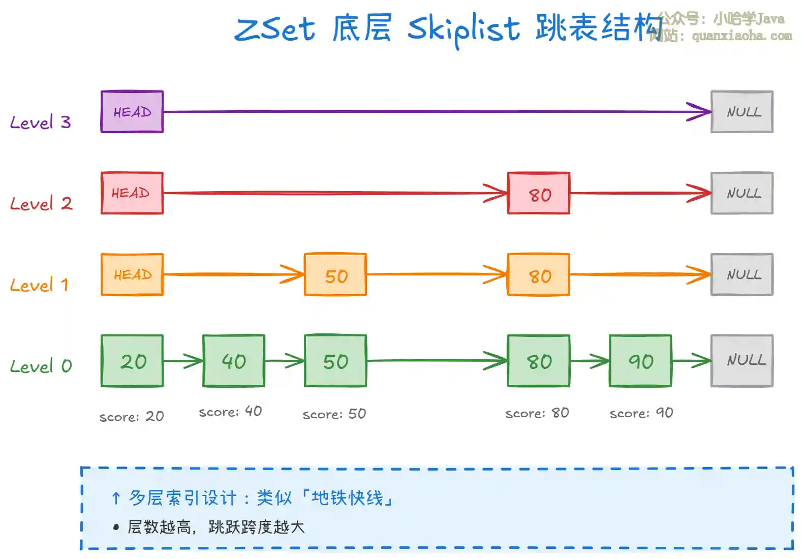 上图展示了 ZSet 底层的跳表(skiplist)结构。跳表的核心思想: