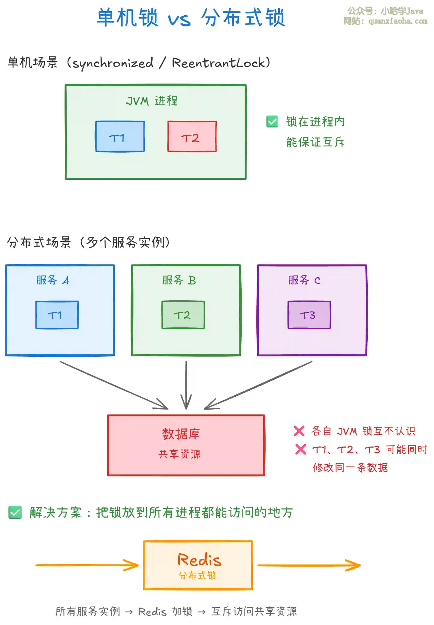 synchronized和ReentrantLock只能在同一个 JVM 进程内生效,跨进程就失效了。 - 分布式锁的本质:把锁的状态放到一个 所有进程共享的存储 中(通常是 Redis),各进程通过访问共享存储来竞争锁。