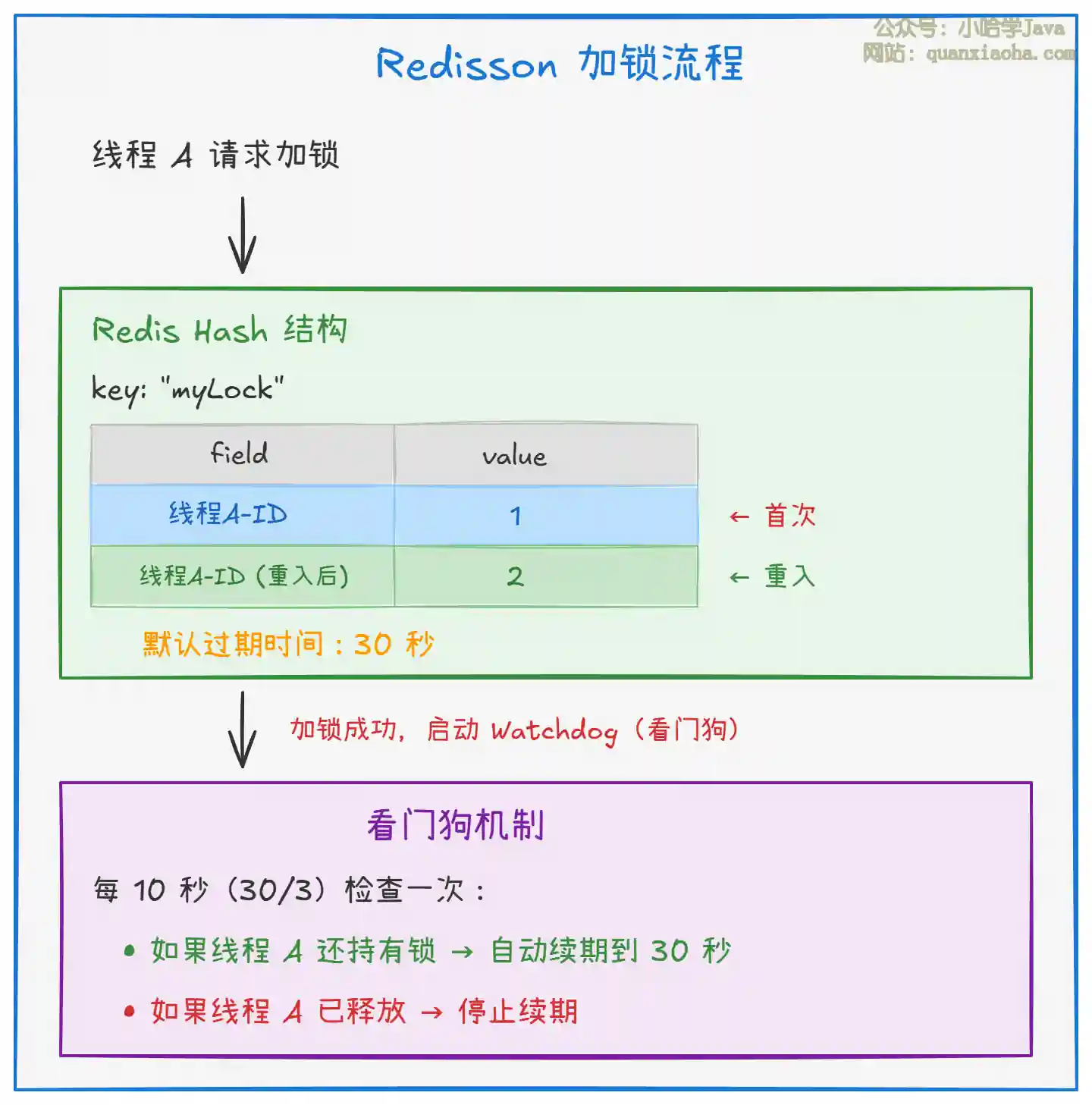 field是线程唯一标识,value是重入次数。同一线程再次加锁时,value + 1;释放一次,value - 1;value减到 0 才真正删除 key。 - 看门狗自动续期:默认锁过期时间 30 秒,看门狗每隔 10 秒(过期时间的 1/3)检查一次,如果锁还被持有就续期到 30 秒,彻底解决了业务执行时间不确定导致的锁提前释放问题。