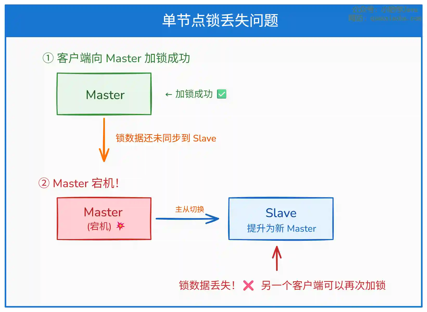 单节点 Redis 存在 主从切换导致锁丢失 的风险: