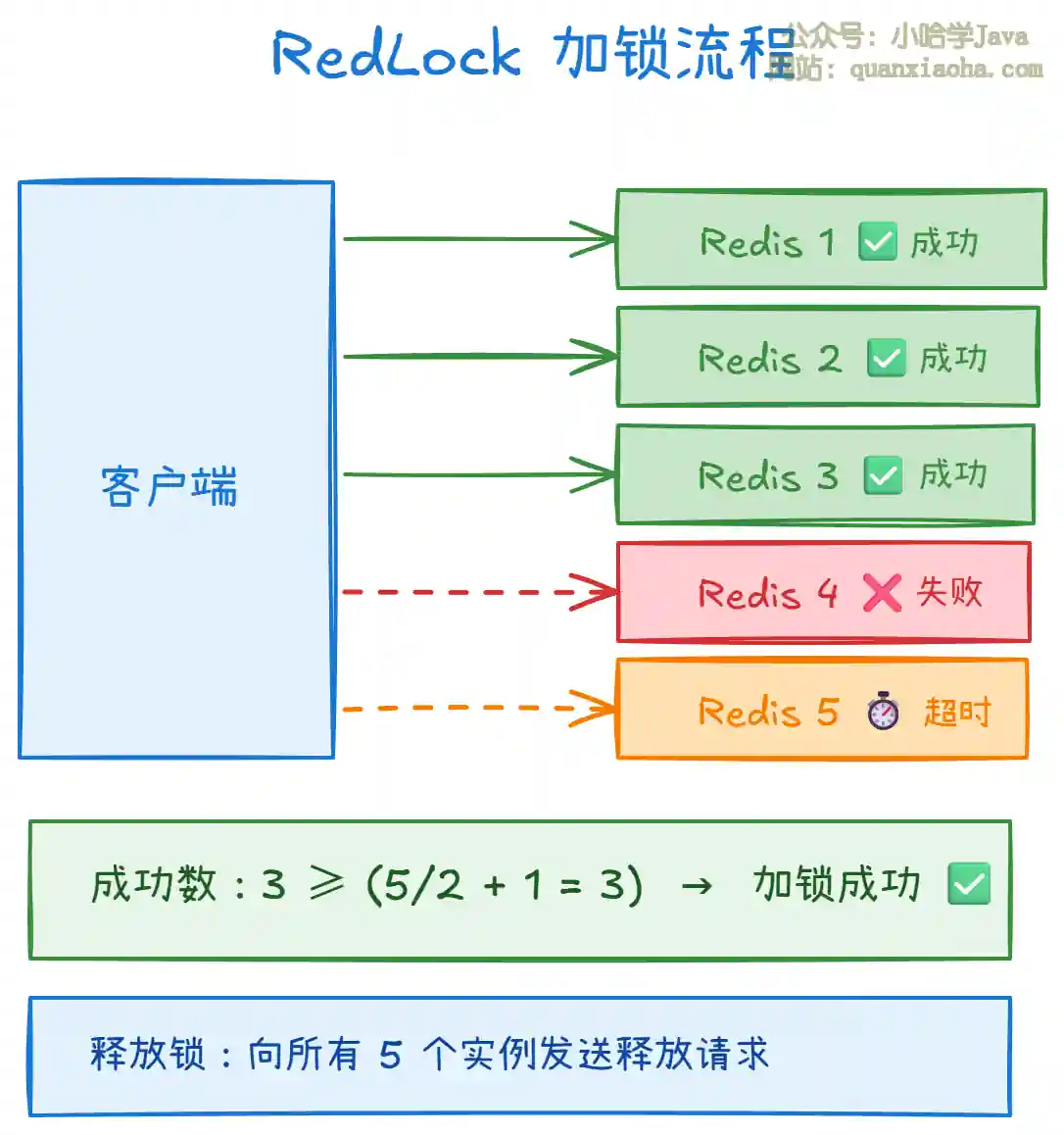 RedLock 的解决方案:使用 N 个独立的 Redis 实例(通常 5 个),加锁时向所有实例发送加锁请求,只有成功在 大多数(N/2 + 1) 实例上加锁,才算成功。