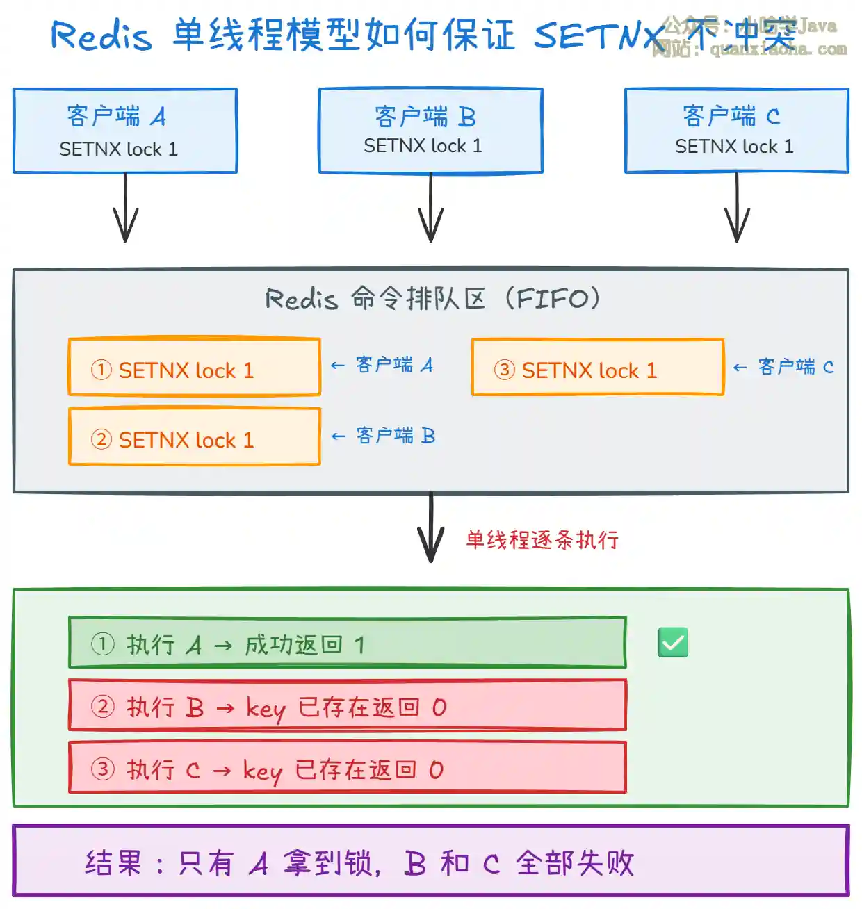 SETNX语义:SET if Not eXists—— 只有 key 不存在时才设置成功。即使 100 个客户端同时发来SETNX,Redis 也会串行处理,只有第一个会成功。- 一条命令就是原子的:单个 Redis 命令(如