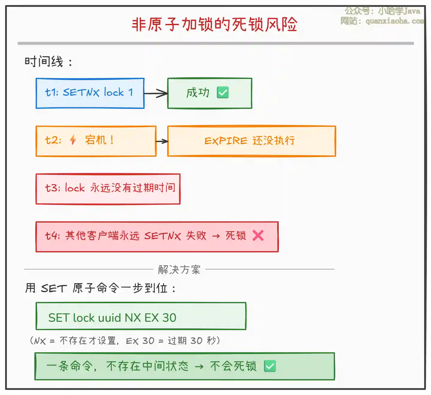 | 加锁非原子 | 两条命令之间宕机,导致死锁 | SET key value NX EX 一条命令搞定 |