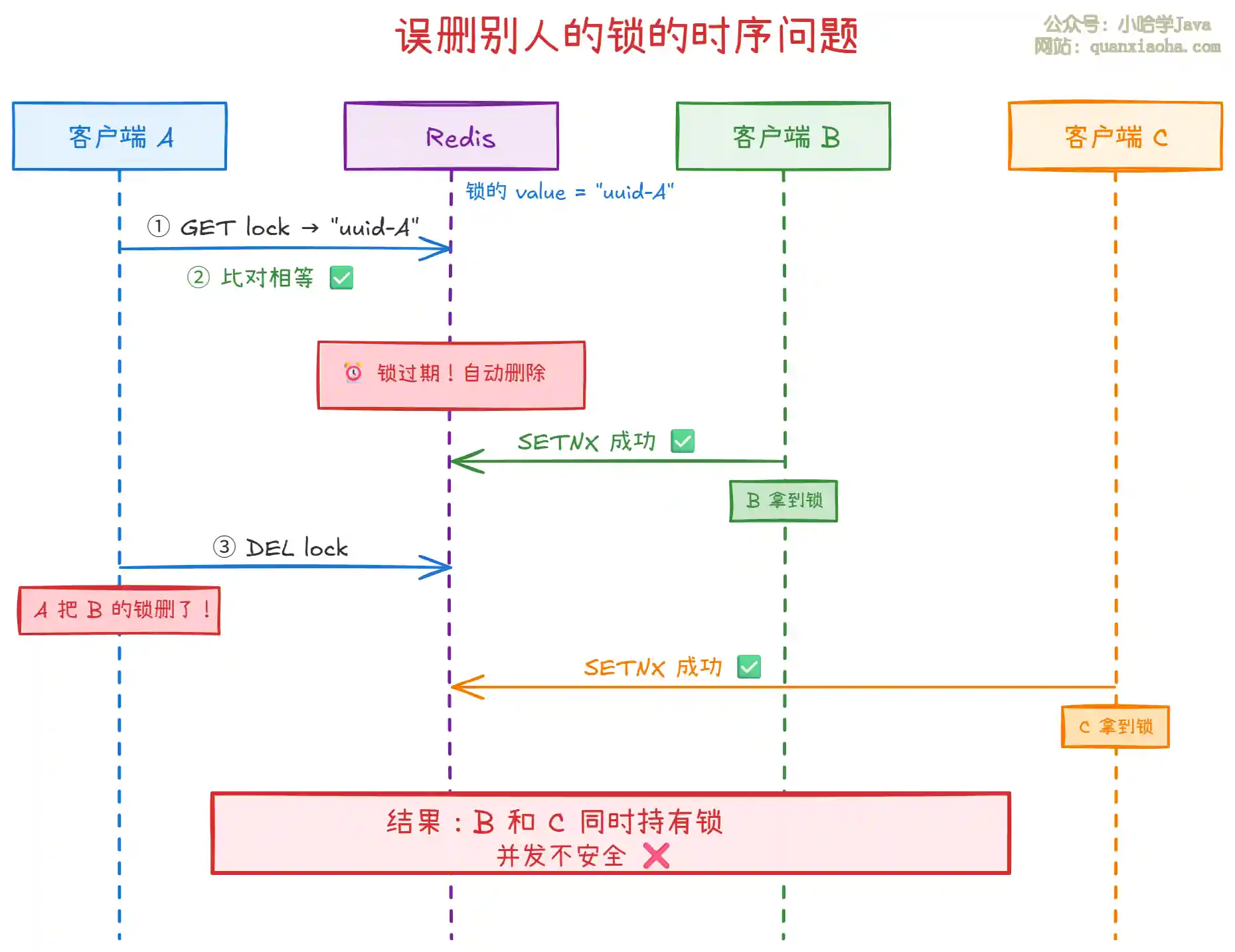上图展示了经典的 "误删别人的锁" 场景:
