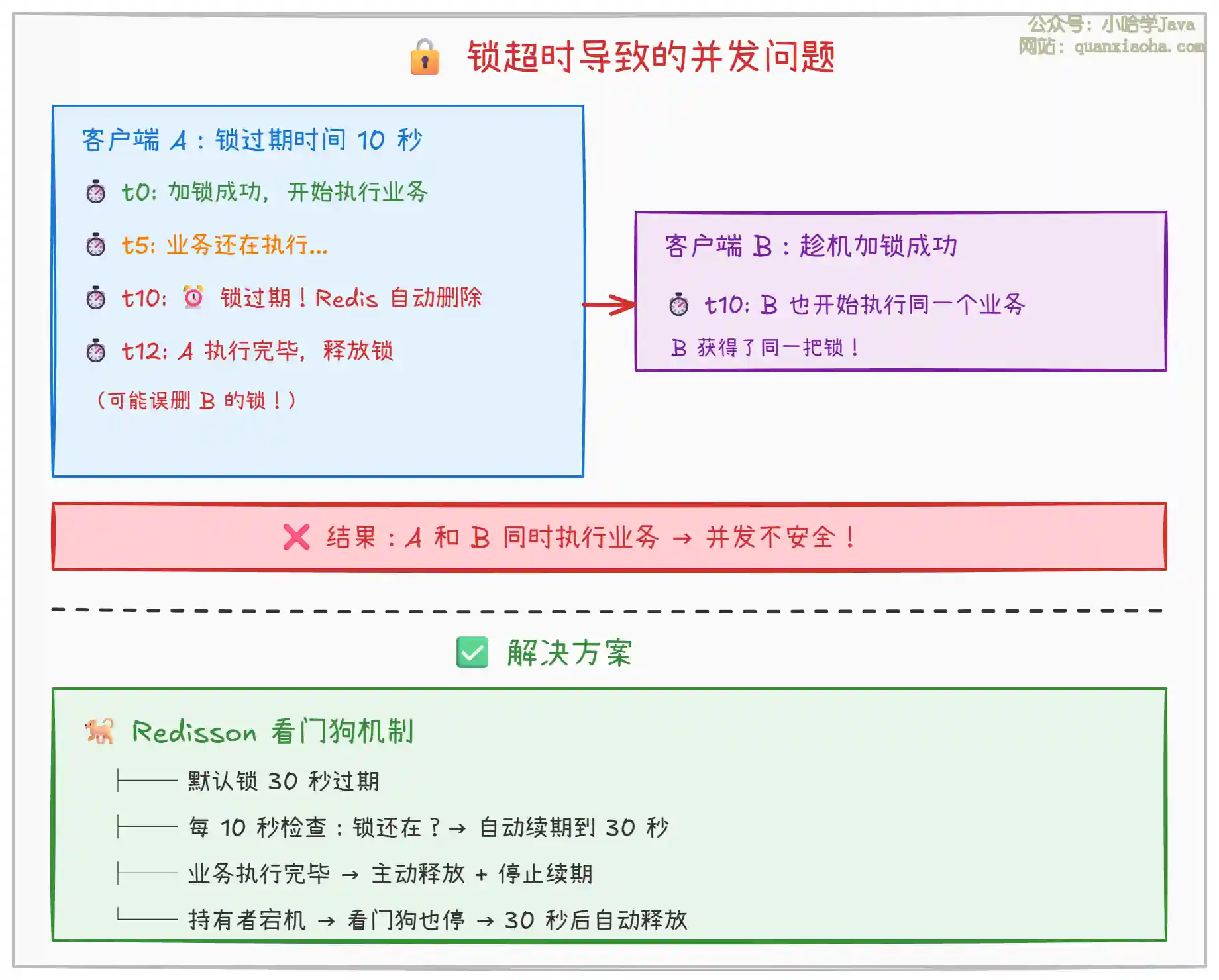 上图展示了锁提前过期导致的并发问题及看门狗解决方案: