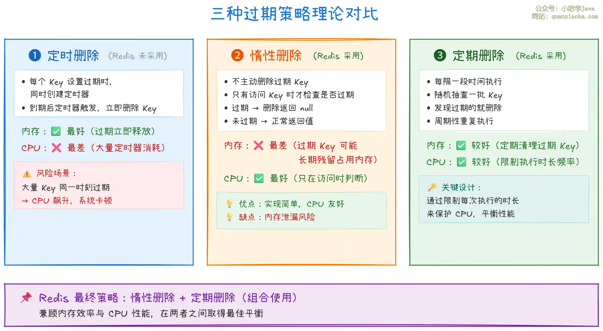 | 定期删除 | 每隔一段时间 | 随机抽查一批 Key,删除过期的 | 折中方案,平衡 CPU 和内存 |