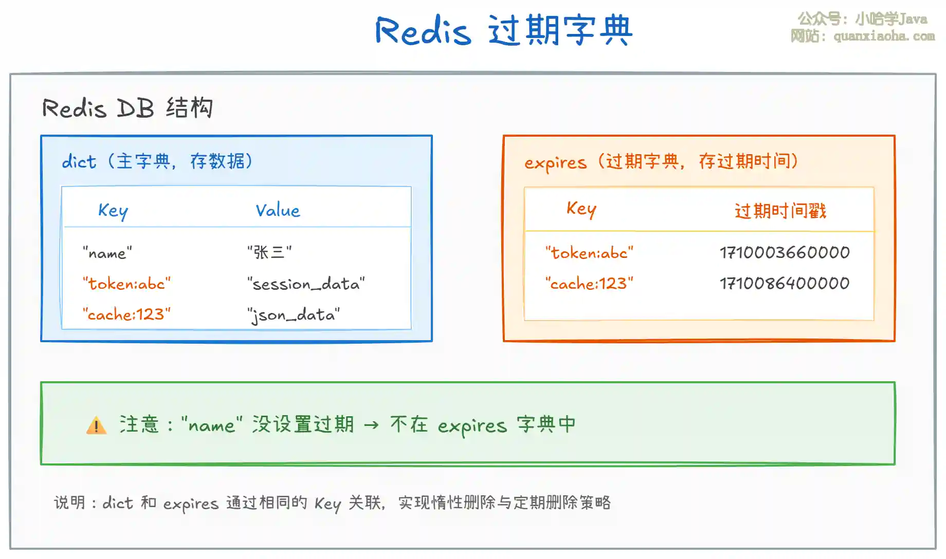 redisDb)中维护了两个字典:dict(主字典,存储所有 Key-Value 数据)和expires(过期字典,存储设置了过期时间的 Key 及其过期时间戳)。 - 过期字典的 key 指向主字典中的同一个 Key 对象(不是副本),所以不会额外占用太多内存。