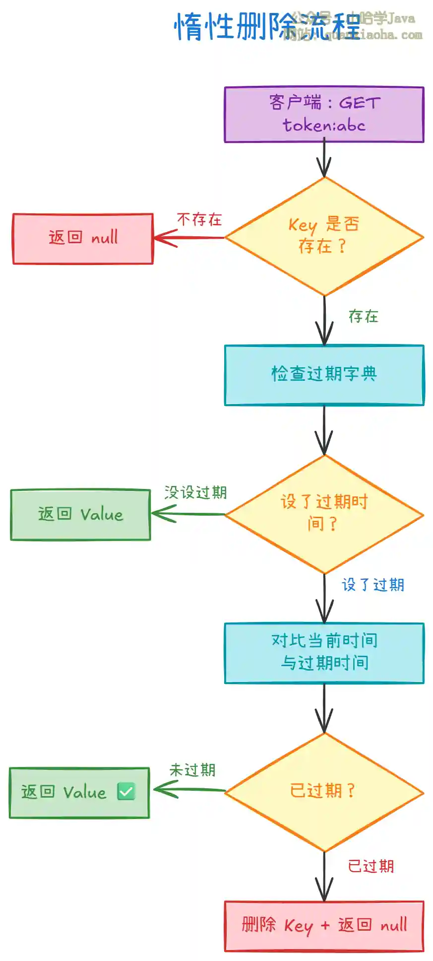 - 核心思路:每次访问 Key 时,顺便检查一下是否过期。如果过期了,就删除并返回空;没过期就正常返回数据。