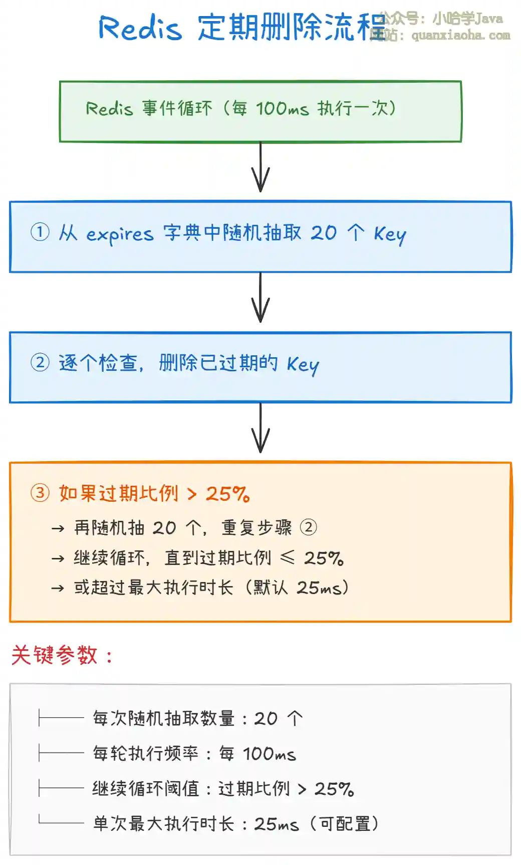 - 为什么限制 25ms:定期删除是在 Redis 主线程中执行的,如果清理时间过长会阻塞正常请求,所以必须严格限制单次执行时长。