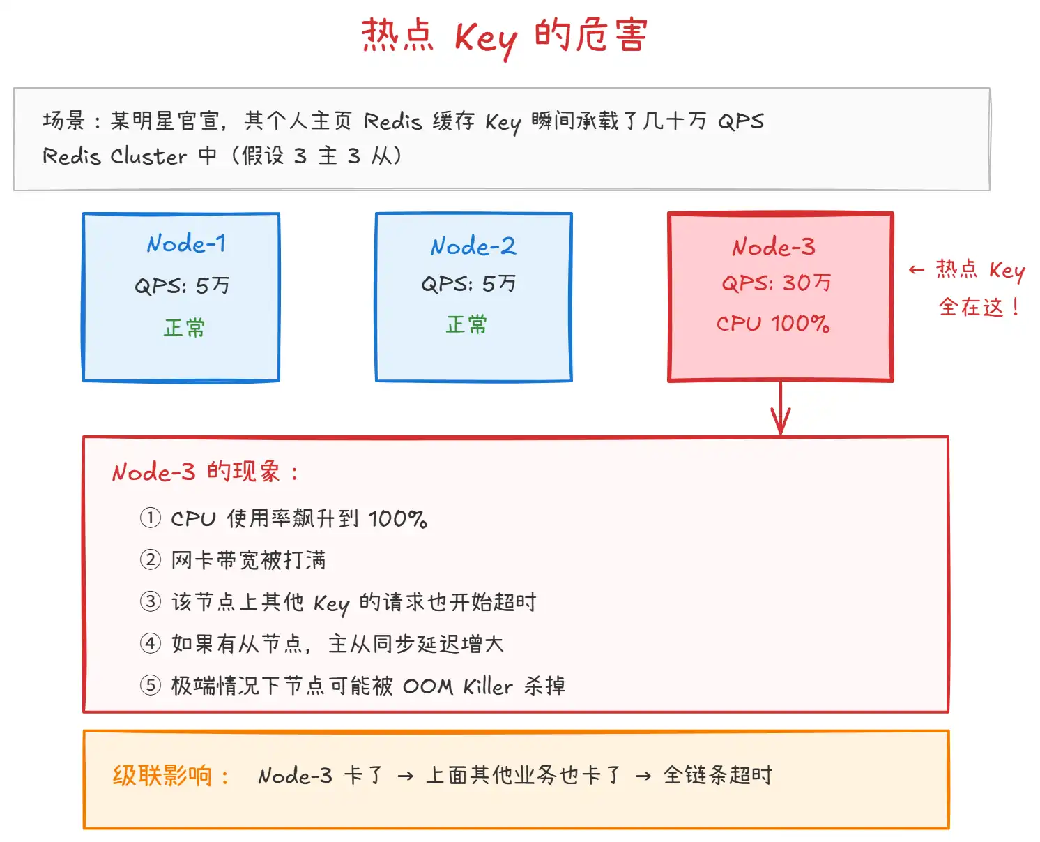 | 核心危害 | 单节点 CPU / 网络被打满 | 主线程阻塞、网络拥塞 |