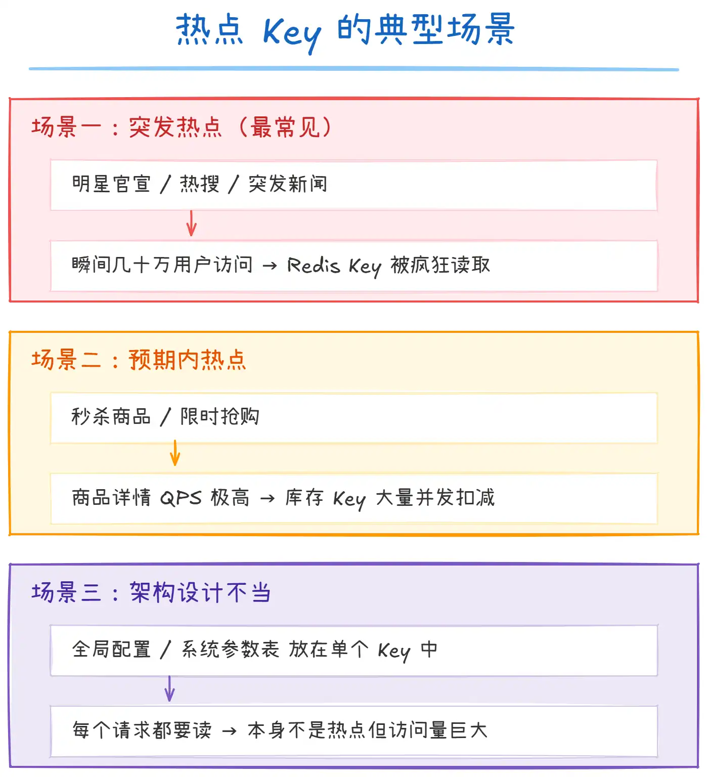 上图列出了热点 Key 的三种典型场景: