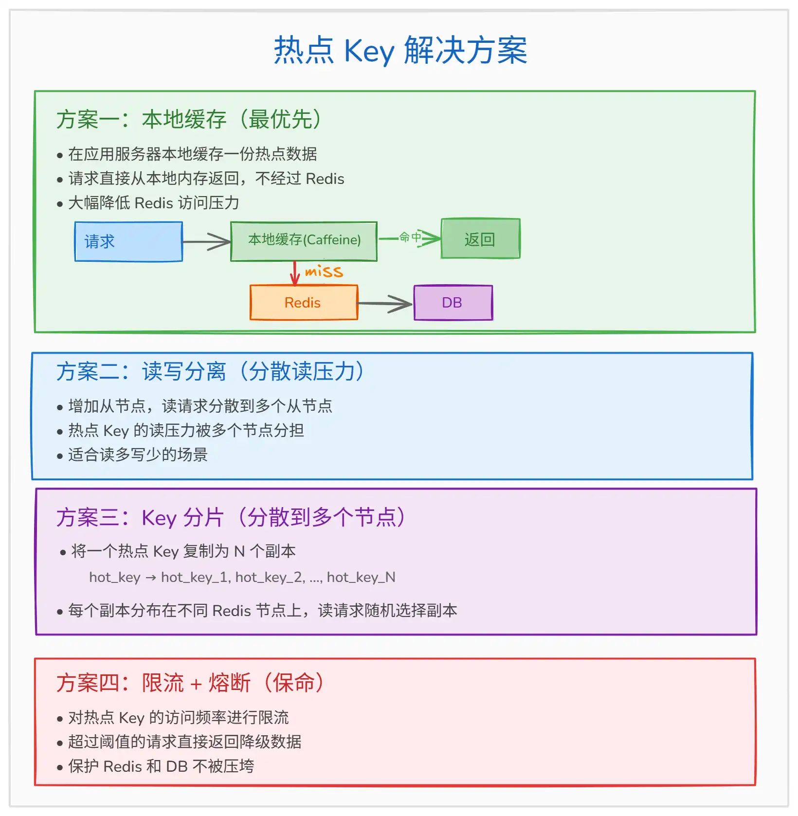 方案设计能力:能否针对不同场景给出对应的解决方案(本地缓存、读写分离、Key 分片),并说明各自的适用场景和优缺点。
