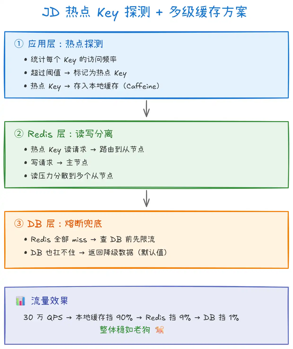 - 第三级:DB 熔断兜底(1% 请求):Redis 全部 miss 时,查 DB 前先限流,DB 扛不住则返回降级数据。