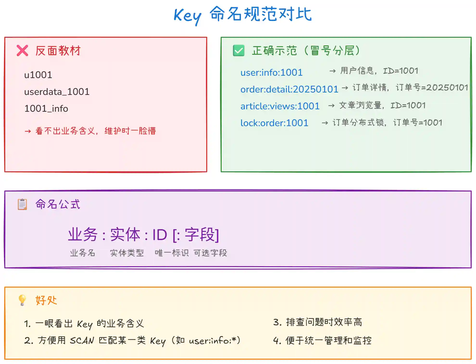 user:info:1001和 B 业务的user:info:1001就冲突了。加个业务前缀(如mall、pay、notify)就能彻底避免。 -