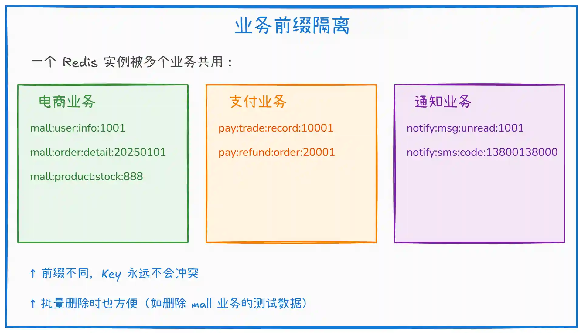 多个业务共用一个 Redis 实例时,必须加业务前缀做隔离。