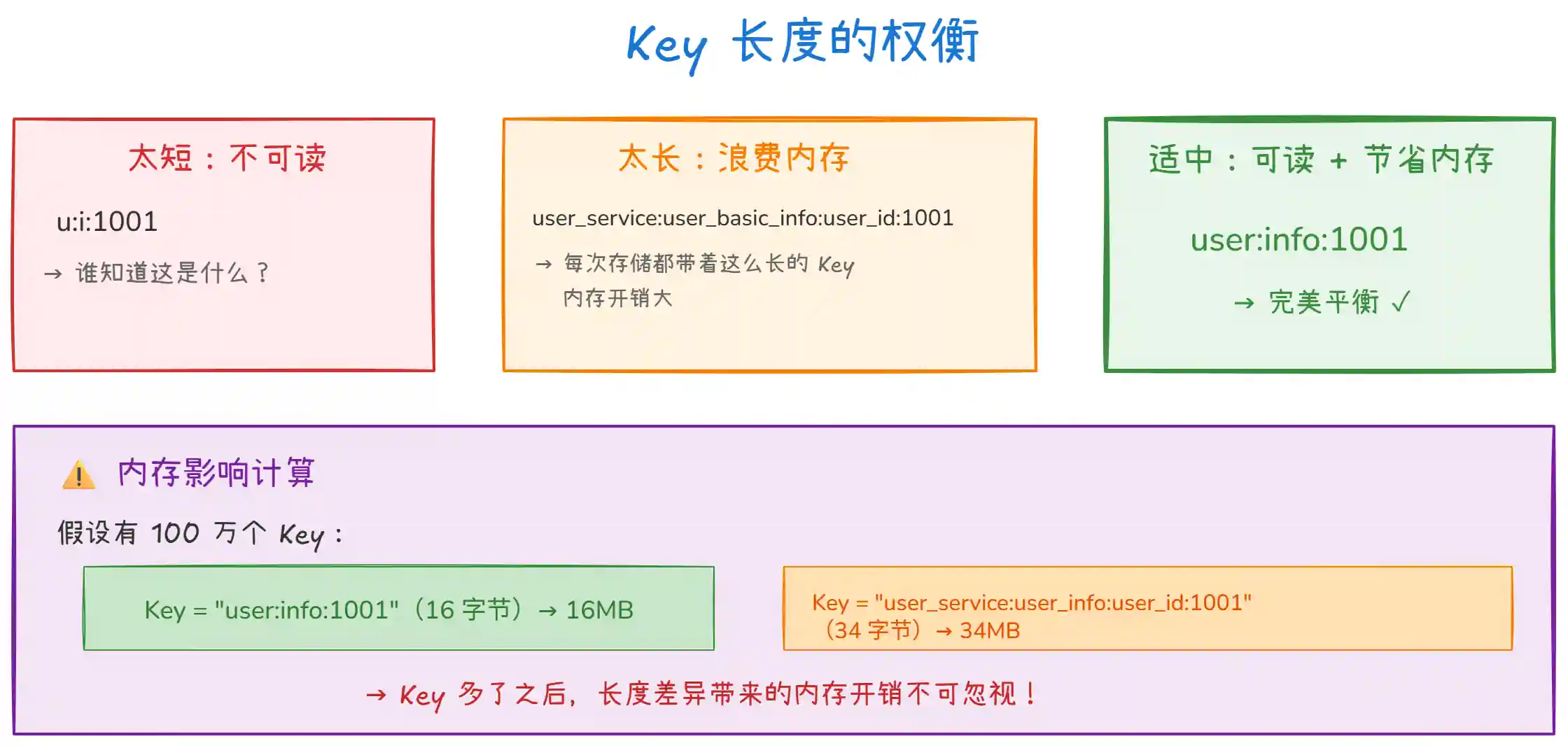 | Key | 长度控制 | 别太长(费内存),别太短(不可读) |