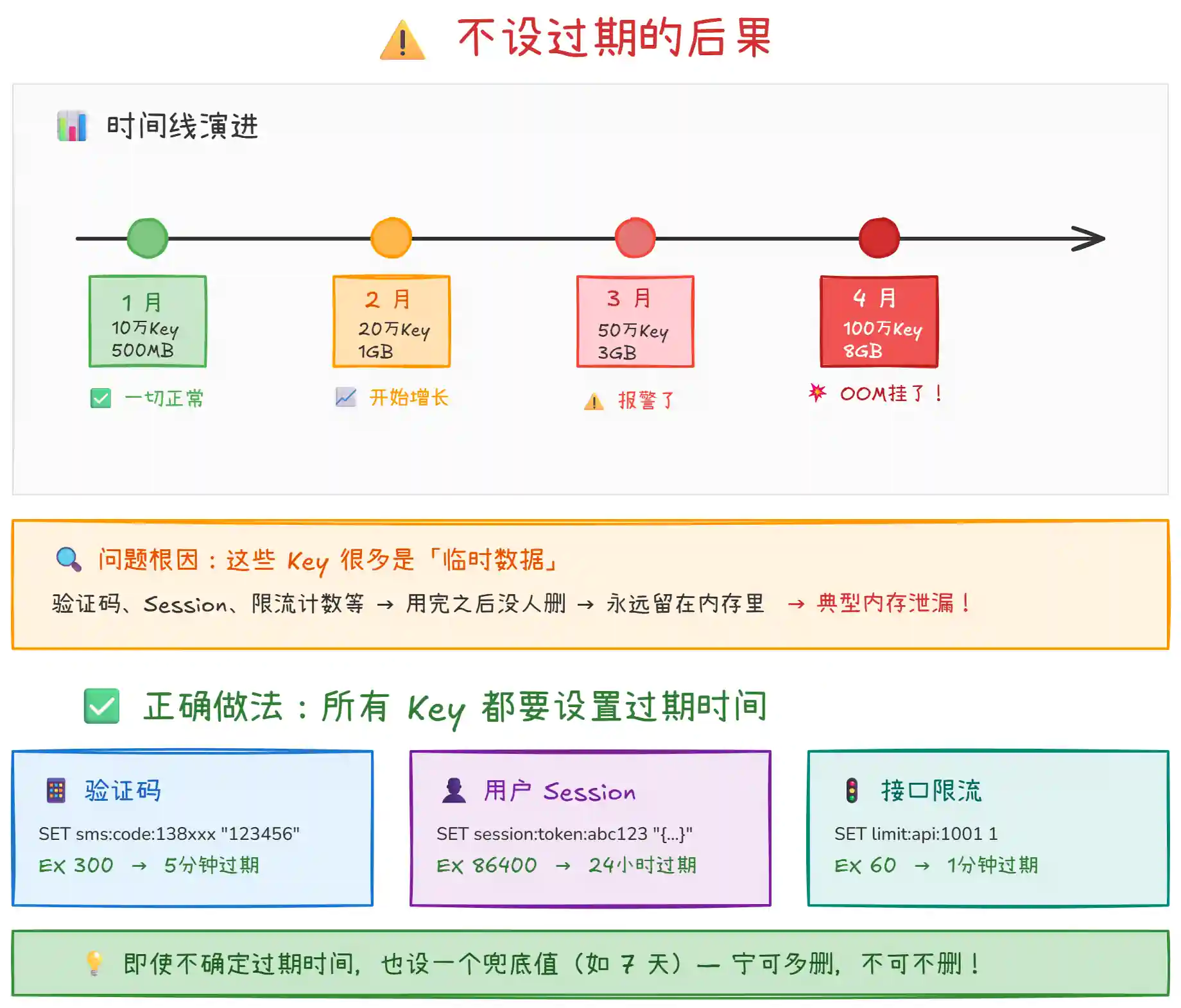 内存持续增长:不断写入新 Key,旧 Key 永远不删除,内存只增不减。几个月后 Redis 内存被打满,触发 OOM 或者淘汰策略,生产事故就来了。