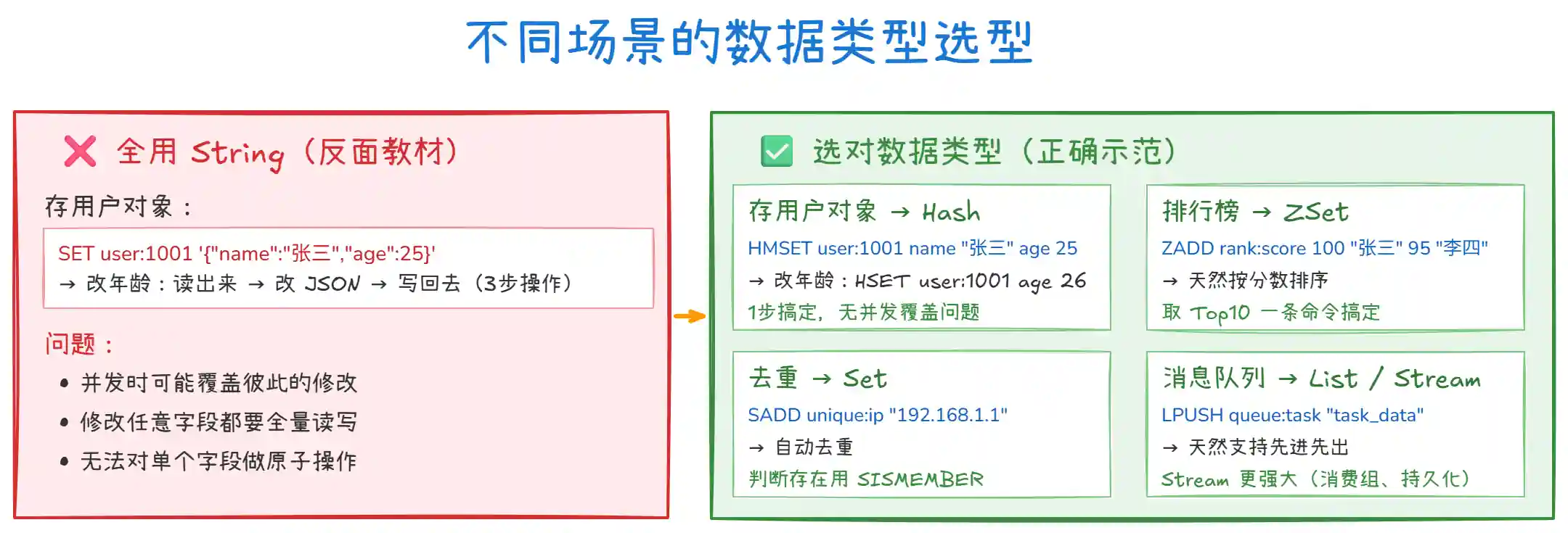 | Value | 选对数据类型 | Hash 存对象,ZSet 做排序,别全用 String |