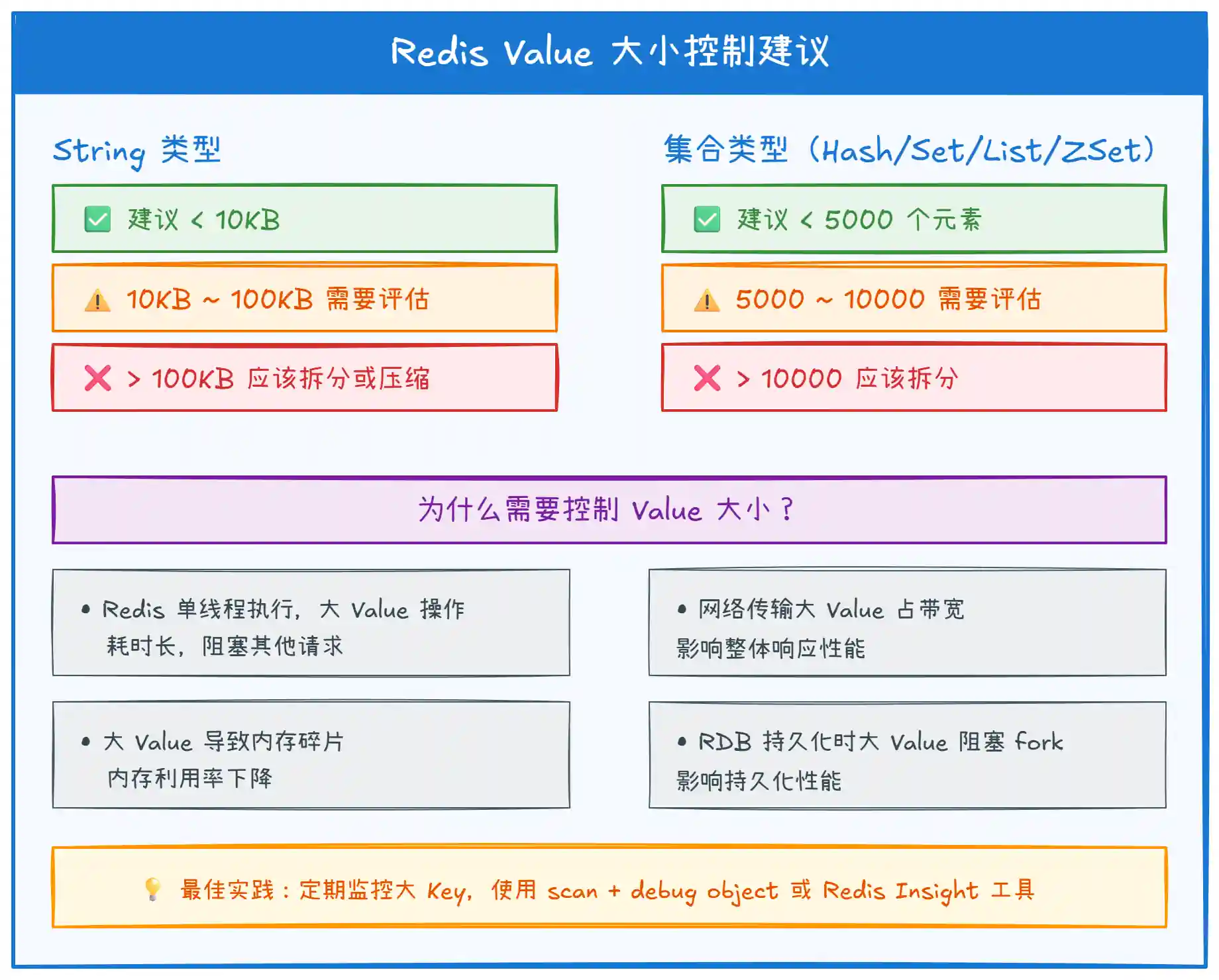 | Value | 控制大小 | Value 尽量精简,避免存大数据 |