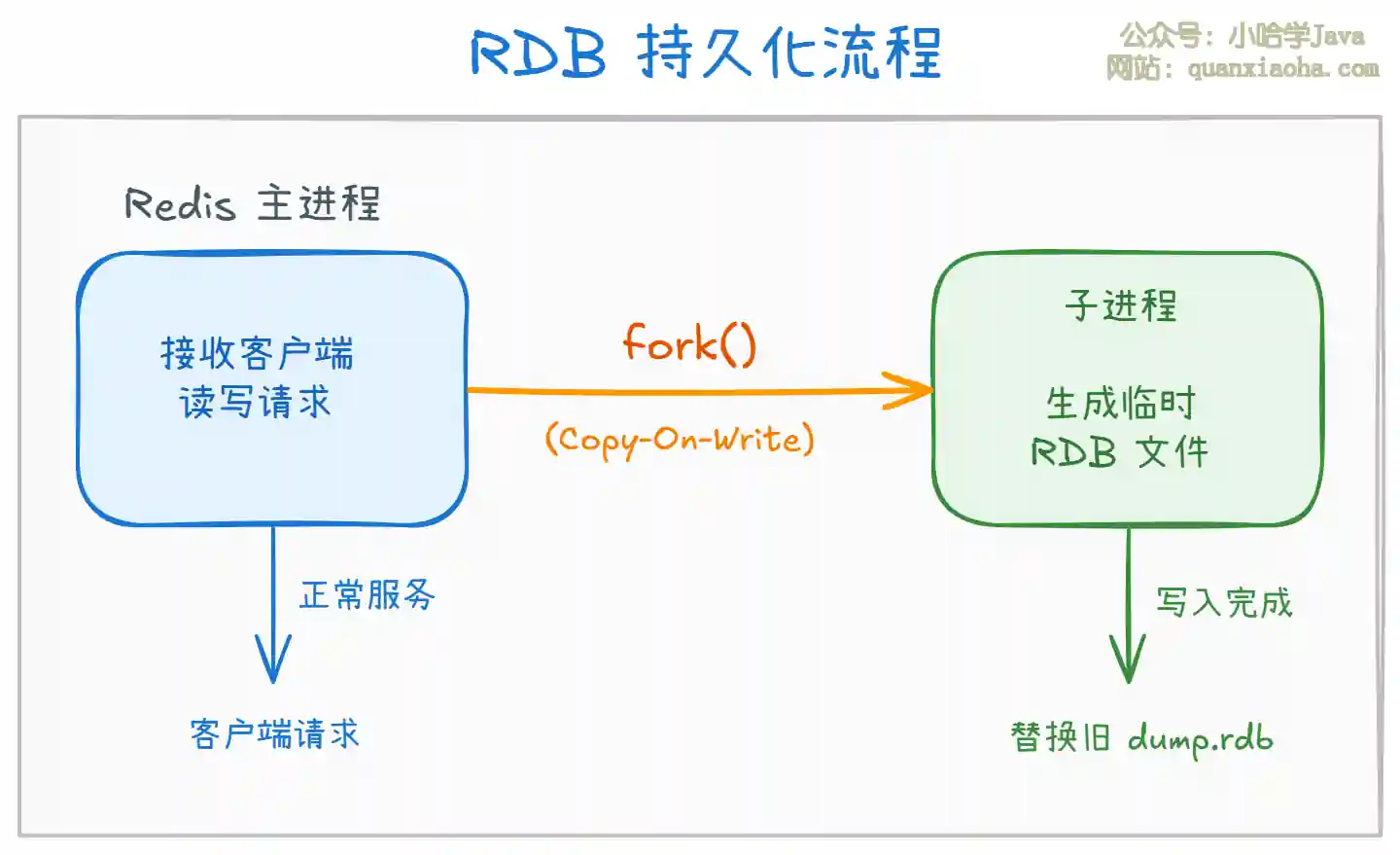 fork()子进程:Redis 主进程调用fork()创建子进程,利用操作系统的 写时复制(Copy-On-Write,COW) 机制,子进程共享主进程的内存页。主进程继续处理客户端请求,只有在内存页被修改时才会真正复制。- 生成 RDB 文件:子进程将内存数据以二进制格式写入一个临时文件,完成后替换旧的