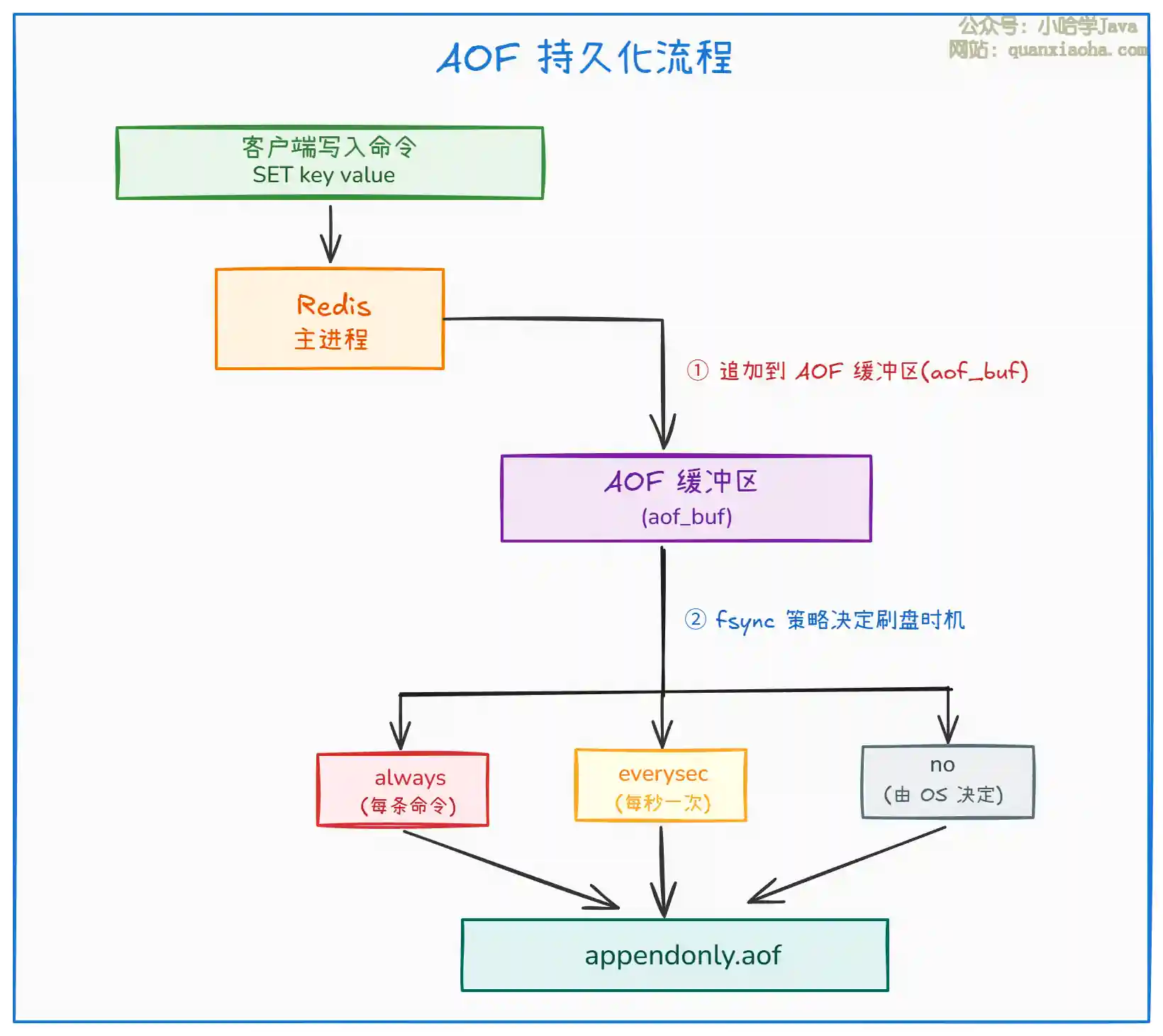 appendfsync配置项决定何时将缓冲区数据写入磁盘:策略 行为 数据安全 性能 always每条命令都 fsync最高,基本不丢数据 最差 everysec每秒 fsync一次最多丢 1 秒数据(推荐) 折中 no由操作系统决定刷盘 可能丢失较多数据 最好