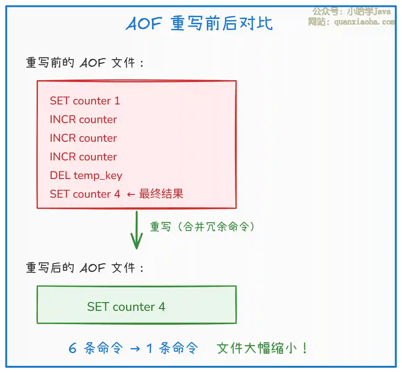随着时间推移,AOF 文件会越来越大。Redis 提供了 AOF 重写(Rewrite) 机制来压缩文件。