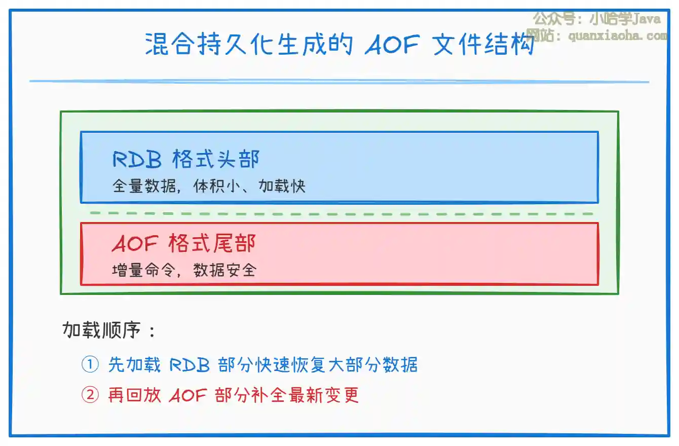 混合持久化:RDB 做底 + AOF 补增量,鱼与熊掌兼得。