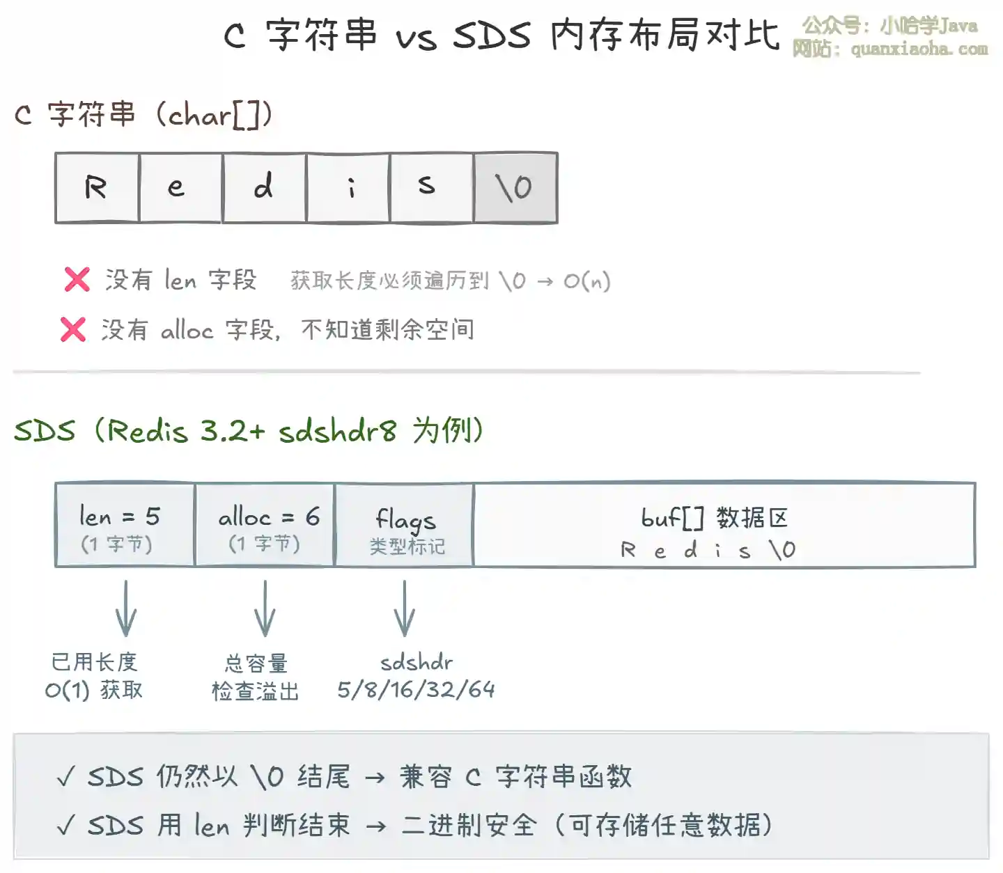 上图展示了 C 字符串和 SDS 的内存布局对比,核心要点: