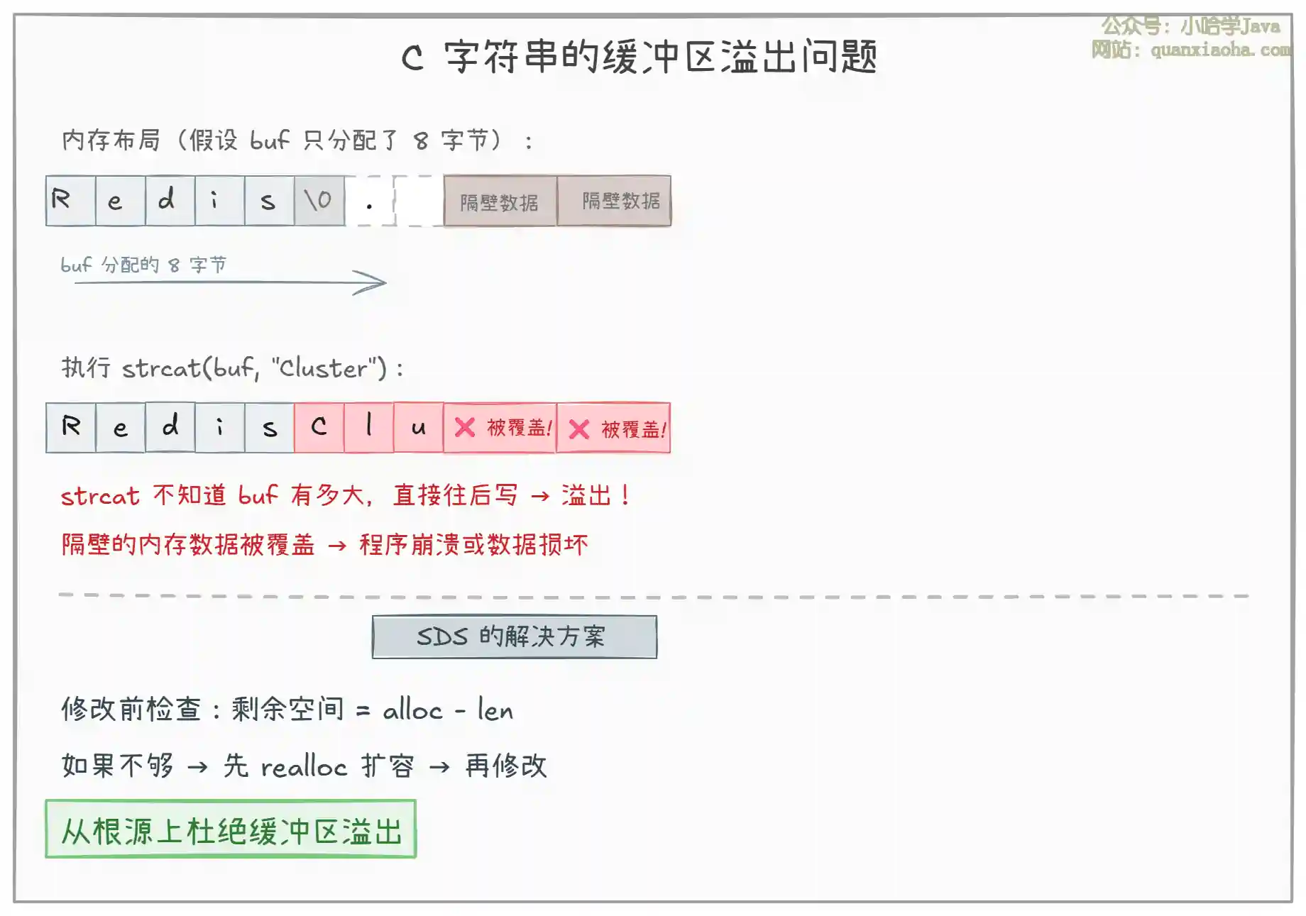 strcat、strcpy等函数 不检查目标缓冲区大小,如果空间不够就直接往后写,覆盖相邻内存。 - SDS 在每次修改前,先检查