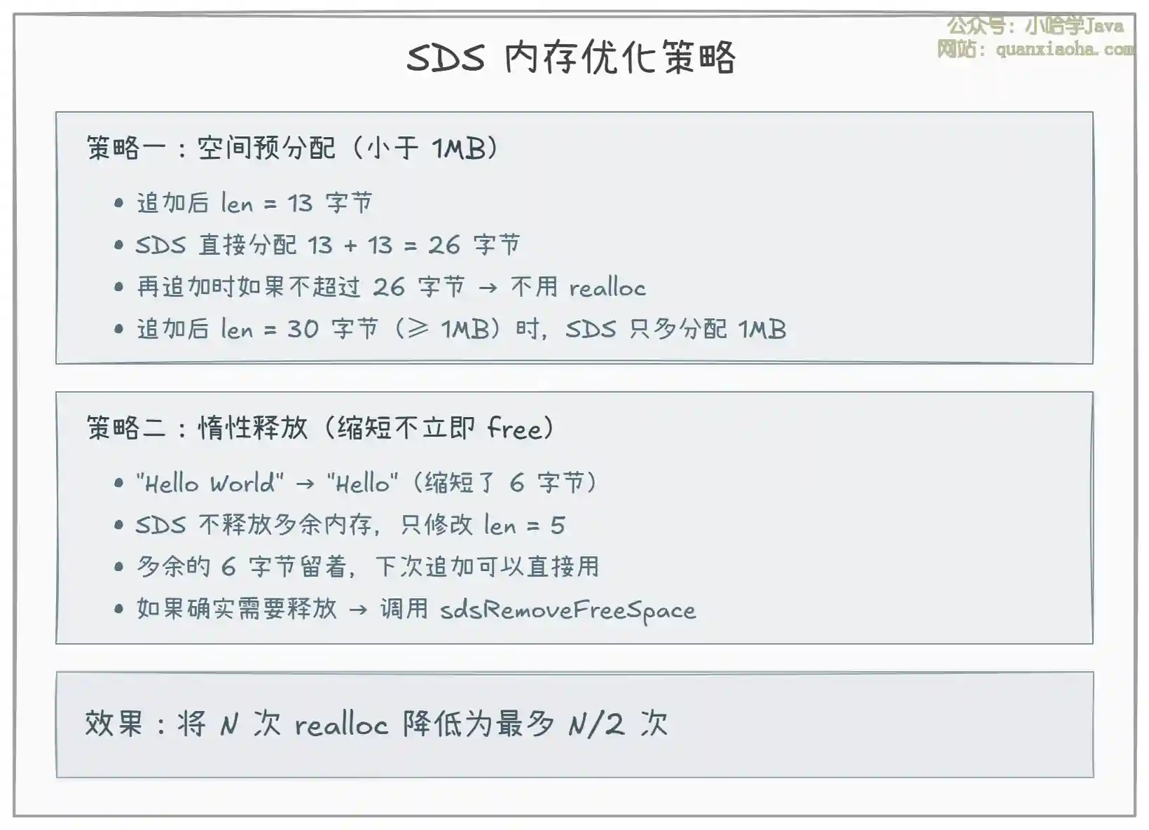 | 频繁内存重分配 | 空间预分配 + 惰性释放 | 大幅减少 realloc 次数 |