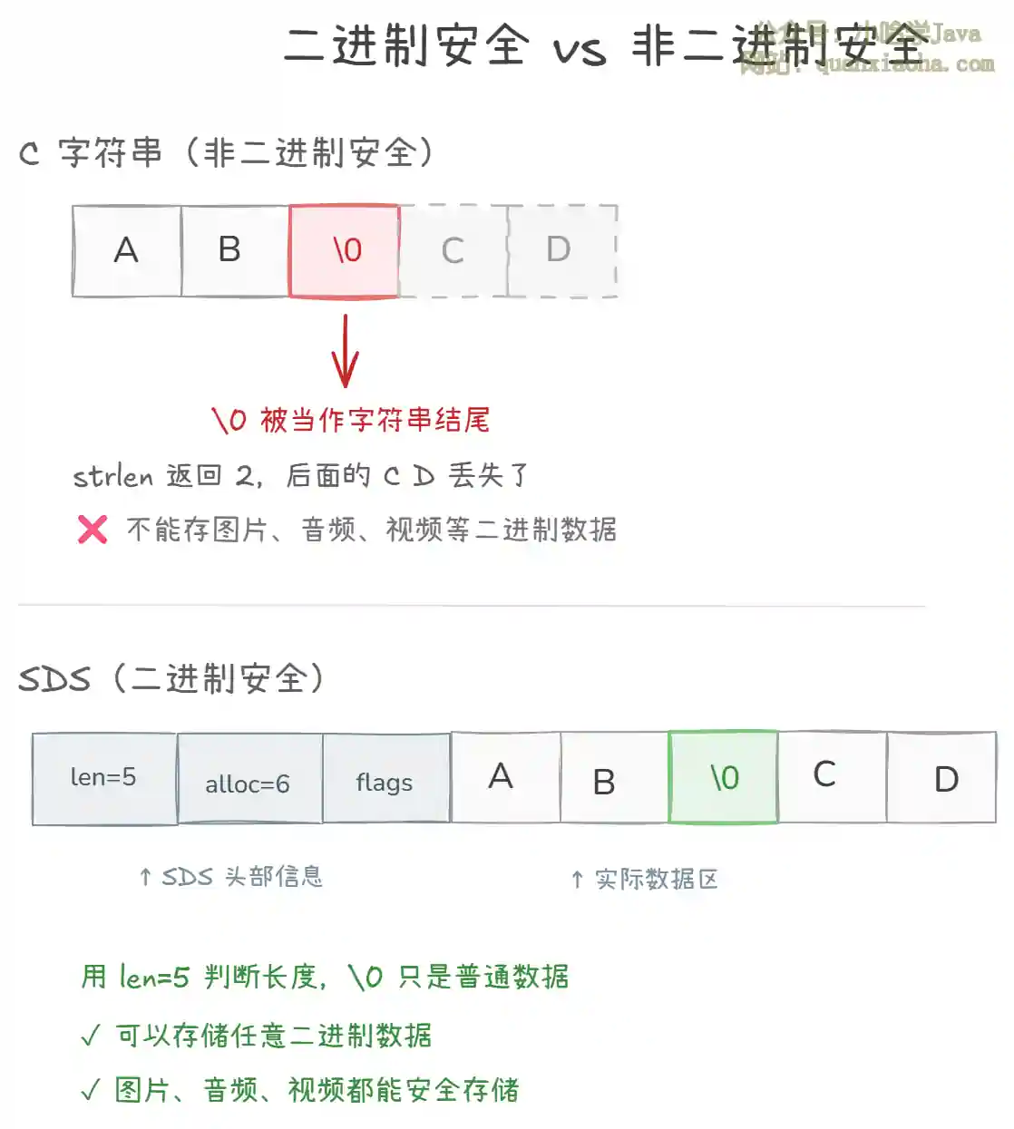 核心一句话:C 字符串靠 \0 管一切,SDS 用 len 管长度、用 alloc 管容量、用 flags 管类型,三个字段解决五大问题。