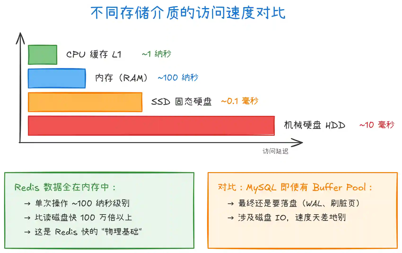上图对比了不同存储介质的访问速度。关键点: