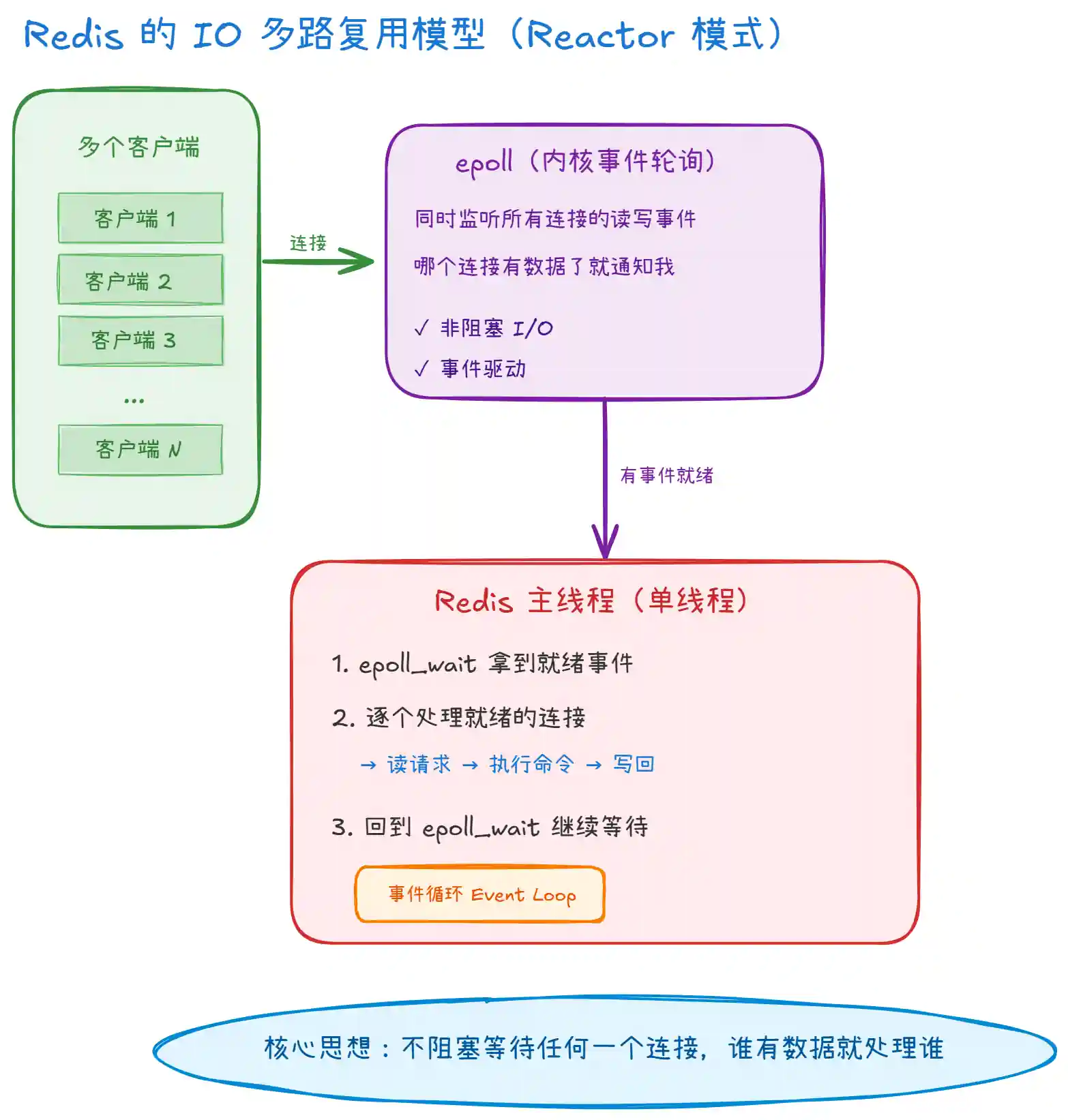 epoll_wait。有事件就处理(读请求、执行命令、写响应),没事件就阻塞等待(不消耗 CPU)。整个过程中,单线程高效地轮流服务所有客户端,没有任何阻塞。 -
