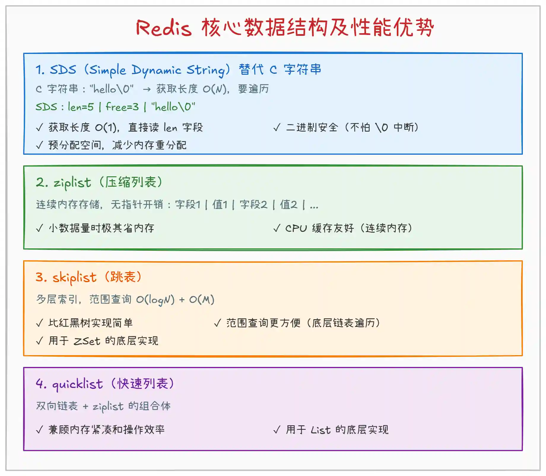 上图展示了 Redis 的核心数据结构及其性能优势: