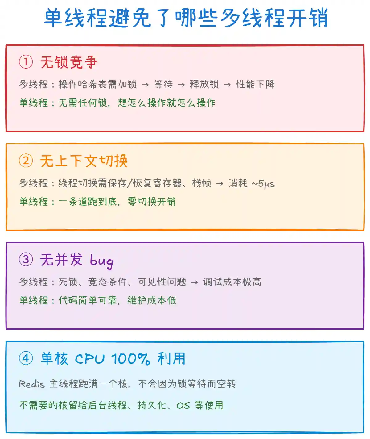 | 单线程避免开销 | 无锁竞争、无上下文切换、无并发 bug | ⭐⭐⭐⭐ |