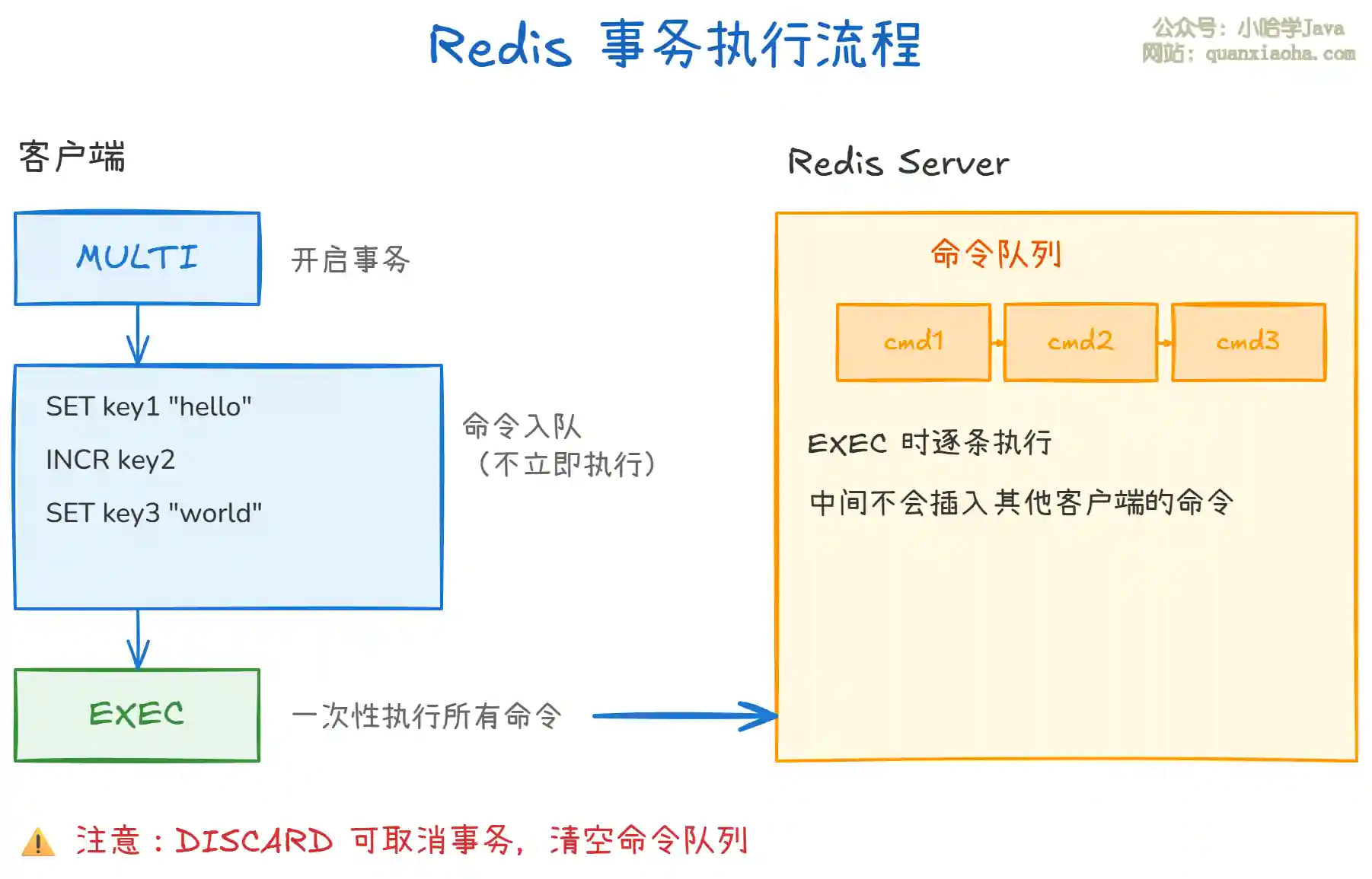 QUEUED表示入队成功。 EXEC:一次性执行队列中的所有命令。在EXEC执行期间,Redis 不会插入其他客户端的命令。DISCARD:取消事务,清空命令队列,放弃执行。