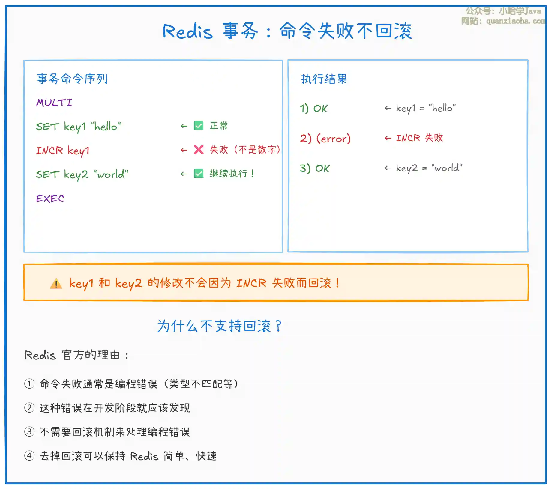 INCR),这类错误应该在开发测试阶段就被发现并修复,而不是在运行时通过回滚来处理。去掉回滚机制使得 Redis 的实现更简单、性能更高。如果你需要回滚能力,应该使用关系型数据库。 -